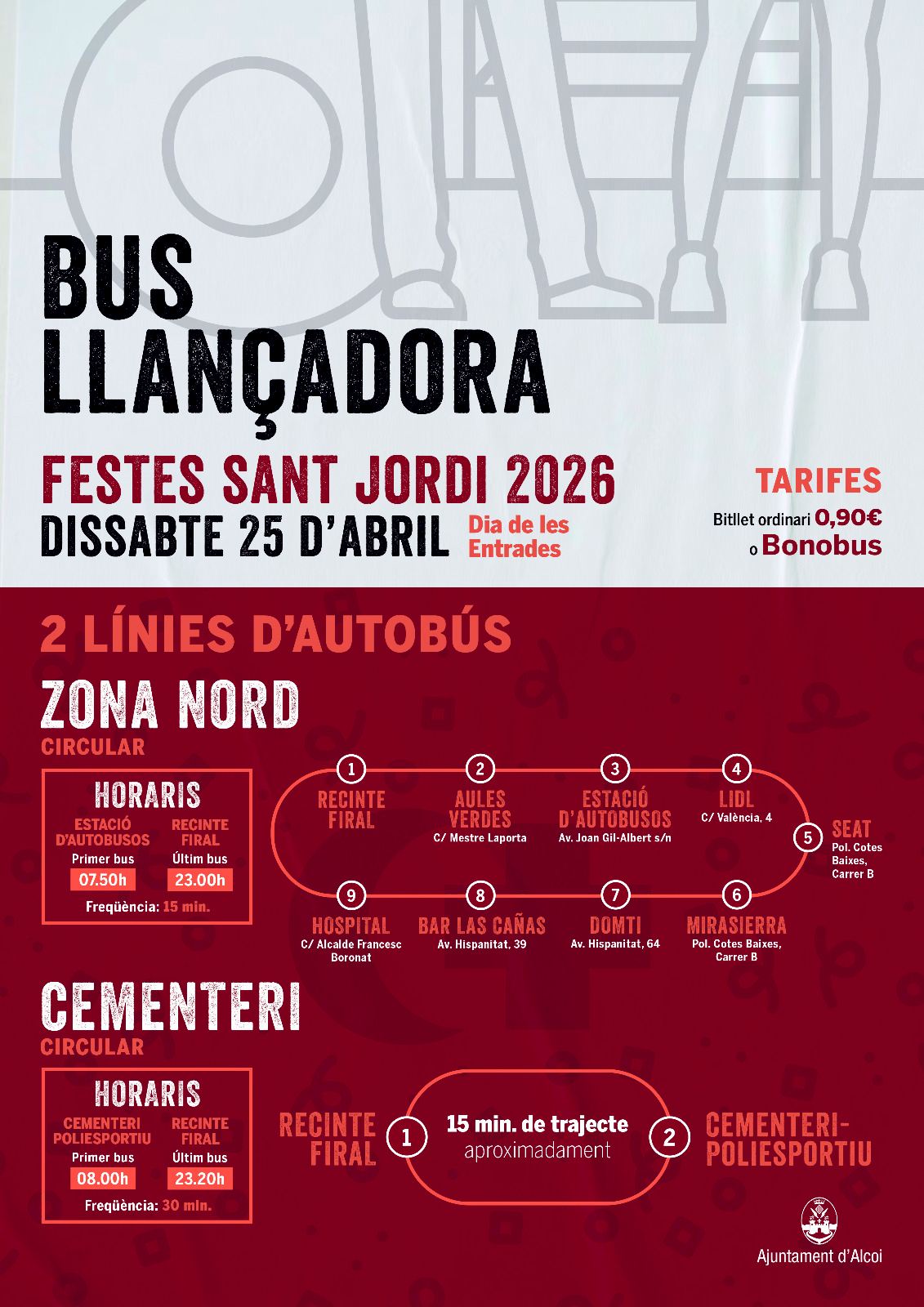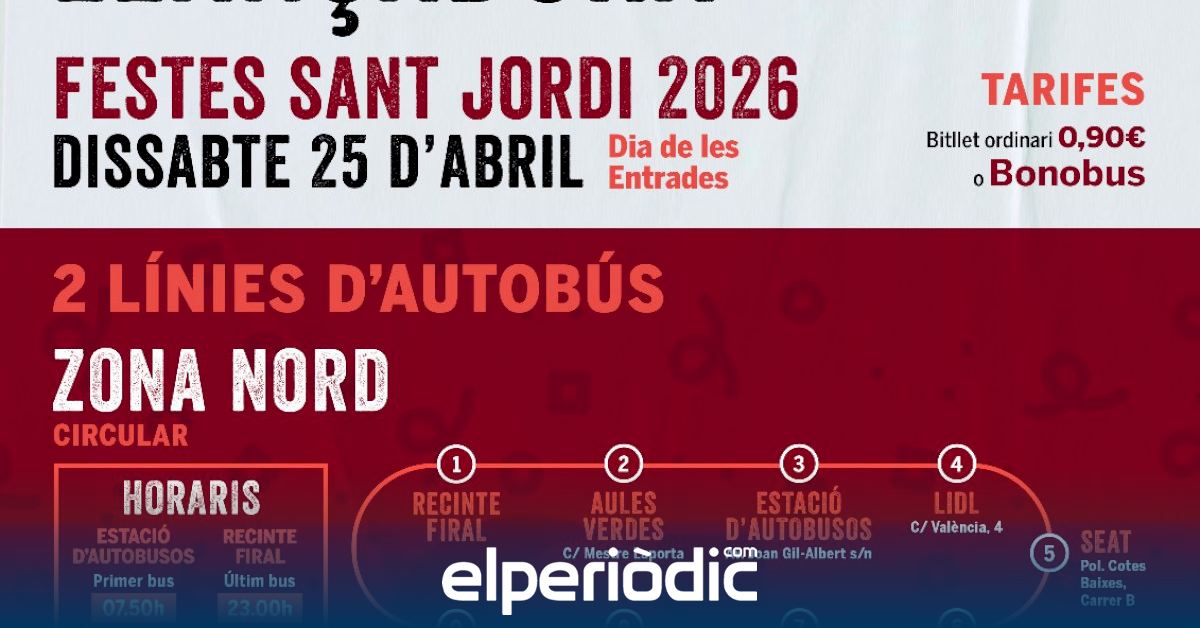 El servicio de lanzadera funcionará a pleno rendimiento el sábado 25 de abril, Día de las Entradas, a través de dos líneas circulares. La línea de la Zona Norte operará con una frecuencia de quince minutos, iniciando el servicio a las 07.50 horas y finalizando a las 23.00 horas. Este recorrido efectuará paradas en el Recinte Firal; Aules Verdes en la calle Mestre Laporta; la Estació d'Autobusos en la avenida Joan Gil-Albert; Lidl en la calle València, 4; Seat y Mirasierra en la calle B del polígono Cotes Baixes; Domti en la avenida Hispanitat, 64; Bar Las Cañas en la avenida Hispanitat, 39, y el Hospital en la calle Alcalde Francesc Boronat. Por otro lado, la línea circular del Cementerio tendrá una frecuencia de treinta minutos, con salidas ininterrumpidas desde las 08.00 horas hasta las 23.20 horas. Esta ruta conectará el Recinte Firal con el Cementeri-Poliesportiu, completando el trayecto en aproximadamente quince minutos.