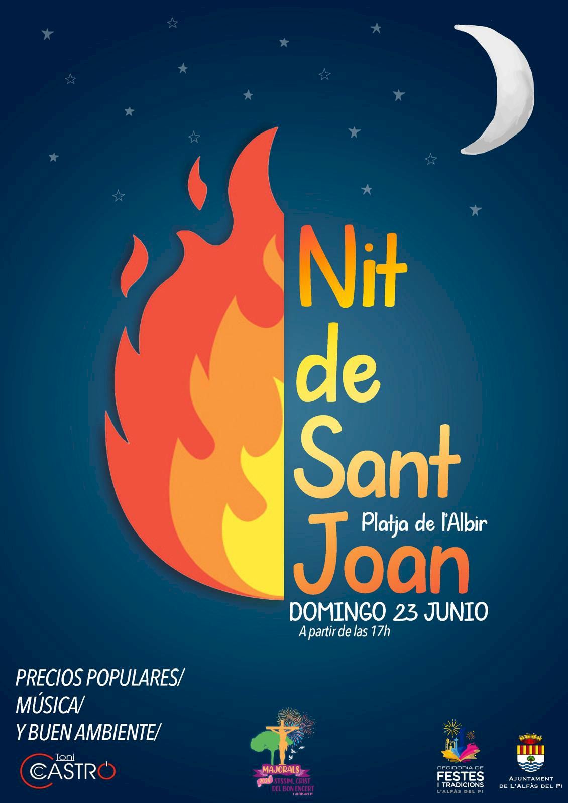 La Nit de Sant Joan se iniciará a las 17,00 horas. La Comisión de Fiestas del Cristo instalará una barra donde se servirán bebidas y comidas a precios populares, desde bocadillos a hamburguesas o helados. La ambientación musical correrá a cargo del DJ Toni Castro. A las doce de la noche se quemará la hoguera oficial, la única permitida en toda la playa de l’Albir.