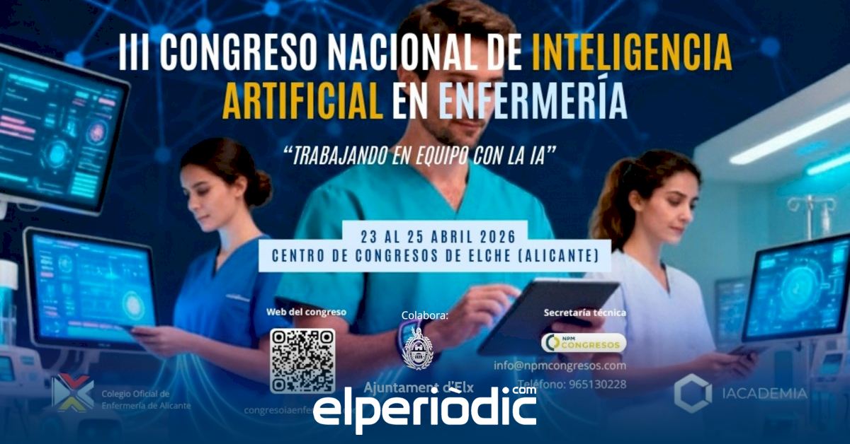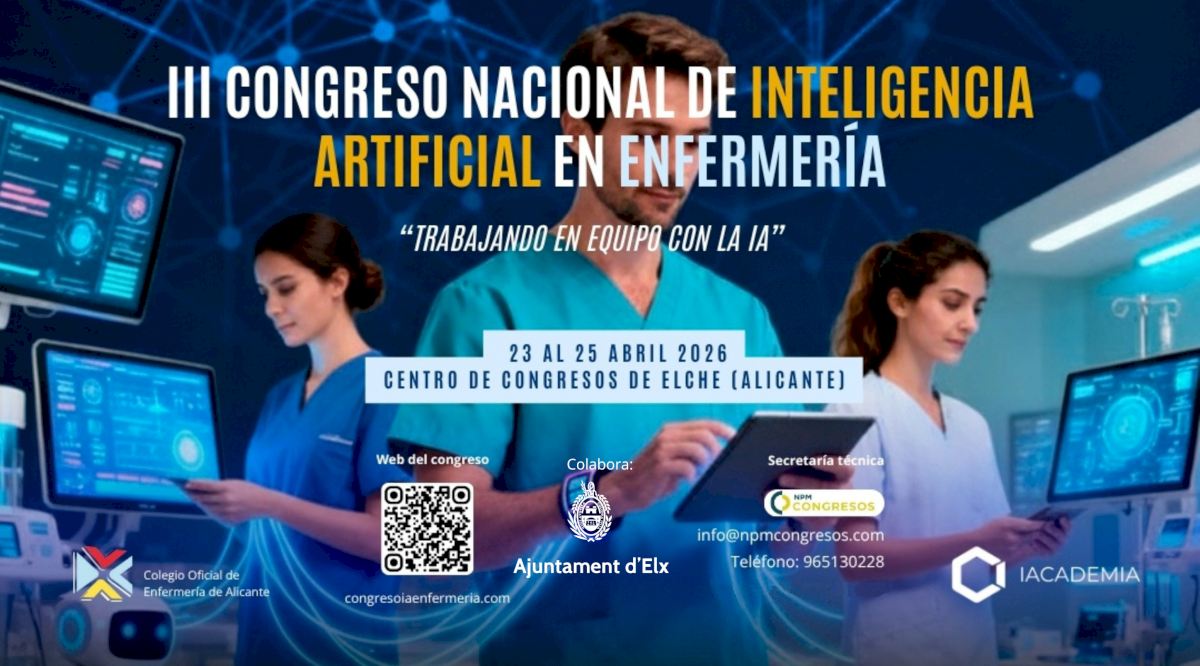La cita congresual tendrá lugar en Elche del 23 al 25 de abril bajo el lema de “Trabajando en equipo con la IA” y estará organizada por el Colegio de Enfermería de Alicante e IAcademia, en colaboración con el Ayuntamiento de Elche