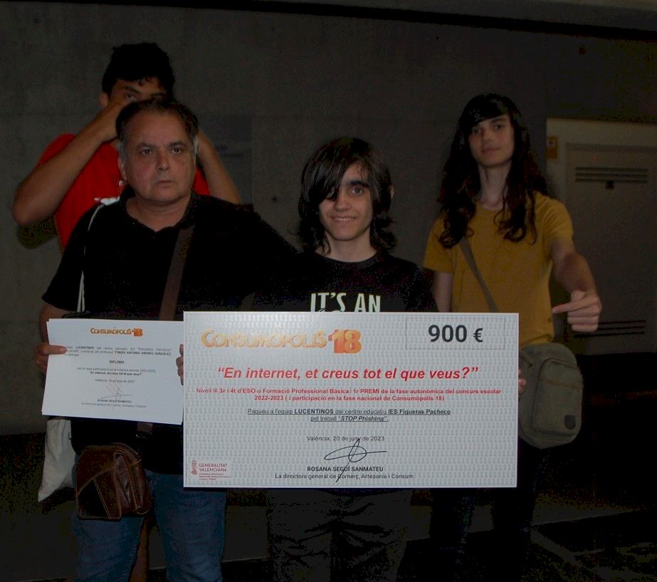 El pasado 20 de junio familiares y alumnado de 1º B y 3º de ESO F asistieron a la gala de la entrega de premios Consumópolis 18 de la fase autonómica de la Comunidad Valenciana que se celebró en Valencia, en el entorno del MUVIM (Museo Valenciano de la Ilustración y de la Modernidad) donde resultó campeón el equipo de 3ESO F del Instituto Francisco Figueras Pacheco de Alicante en la categoría Primera de 3º-4ºESO y FPB, El grupo denominado “Los LUCENTINOS” formados por Oriol Hurtado, Daniel Mira, Alex Tavera, Joan Miguel Orts y Alejandro Manresa, tras la superación de 10 pruebas en la fase 1 y la realización de un vídeo que desarrollaba en este curso el buen uso de las tecnologías con el lema: “En Internet, ¿te crees todo los que ves?” el corto titulado “Stop Phishing” cuya música fue creada por el propio grupo y coordinada por su tutor, fue expuesto en la sala, al mismo tiempo el vídeo ha sido editado en el Canal Generalitat. Este grupo dirigido y coordinado por su profesor Tomás Antonio Andreu González, representará a la Comunidad Valenciana en la fase nacional del concurso. Cabe recordar también, que el curso pasado otro grupo coordinado por el mismo profesor, fue el ganador en la Comunidad Valenciana del Consumópolis 17.