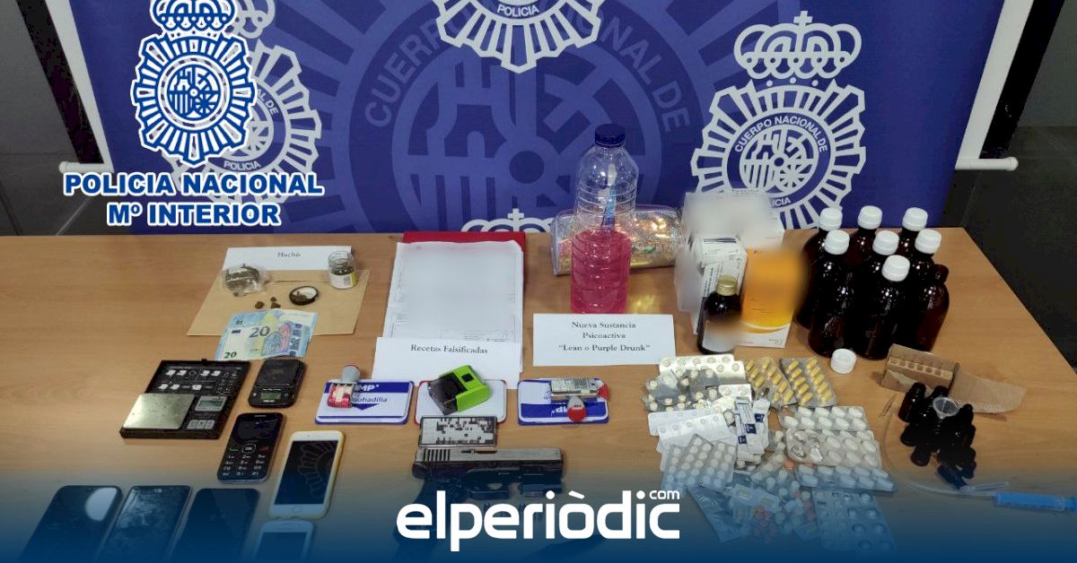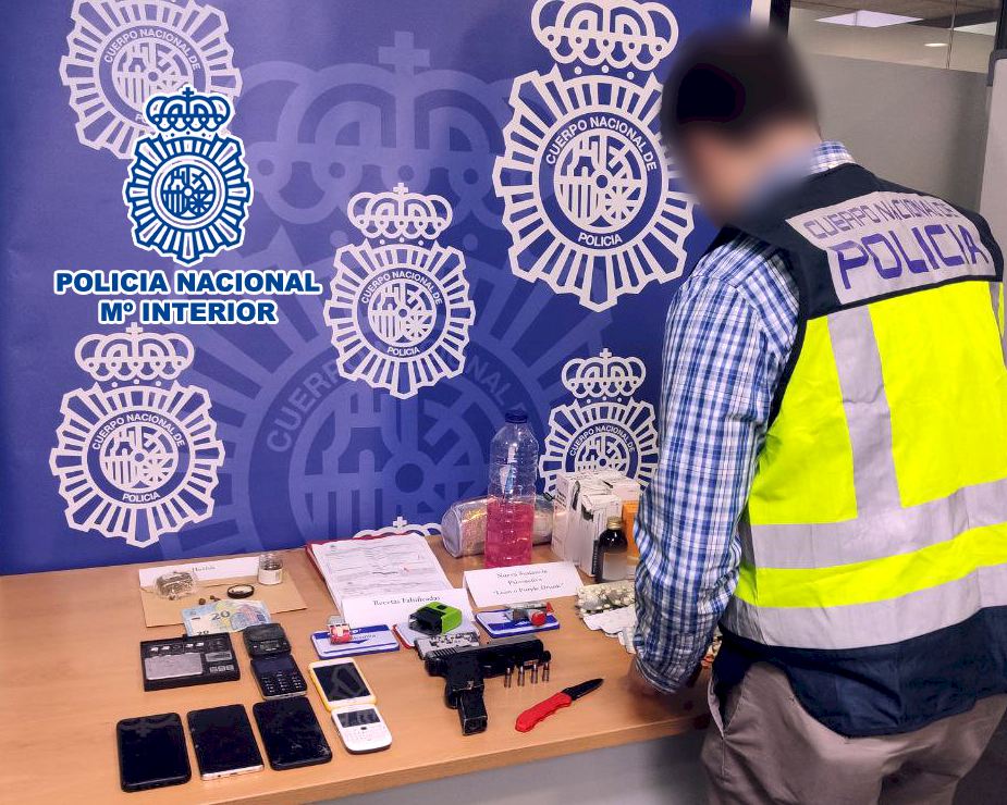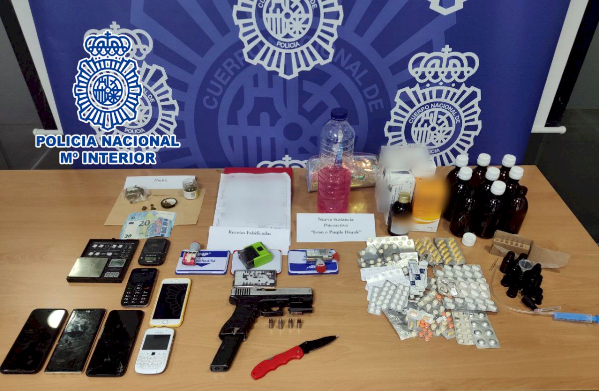 En el registro, los agentes incautaron 40 gramos de hachís, 30 gramos de marihuana, 450 pastillas de ansiolíticos, dos balanzas de precisión, una pistola de aire comprimido y varios cartuchos de pistola, así como varias recetas médicas falsificadas y un sello médico con número de colegiado utilizado para la manipulación y falsificación de dichas recetas.