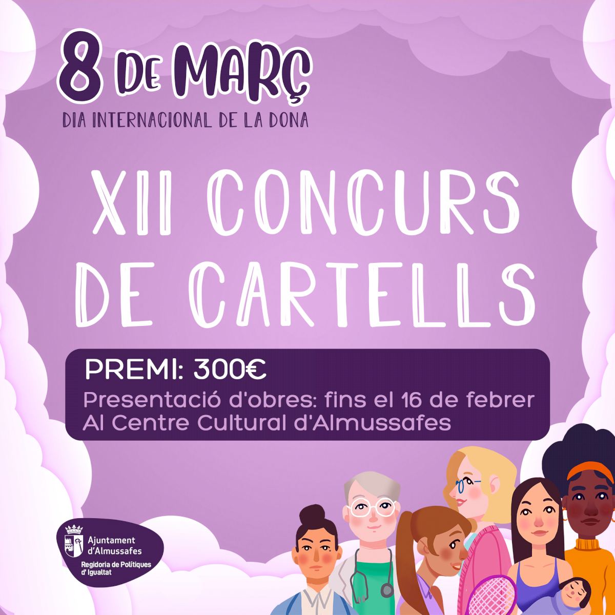 El XII Concurso de Carteles ‘8 de marzo. Día Internacional de la Mujer’, impulsado por la Concejalía de Políticas de Igualdad del Ayuntamiento de Almussafes arranca una nueva edición con la publicación de sus bases. Los trabajos podrán presentarse hasta el próximo 16 de febrero por correo o en la conserjería del Centro Cultural. La obra ganadora recibirá una gratificación económica de 300 euros, galardón que se entregará durante la inauguración de la exposición que reunirá todos los diseños presentados, prevista para el próximo 7 de marzo. “Animo a toda la ciudadanía a participar en esta iniciativa porque sé que en Almussafes hay mucho talento y porque, además, es una forma muy original de participar en una de las conmemoraciones más destacadas de todo el calendario”, declara la concejala de Políticas de Igualdad, Belén Godoy.