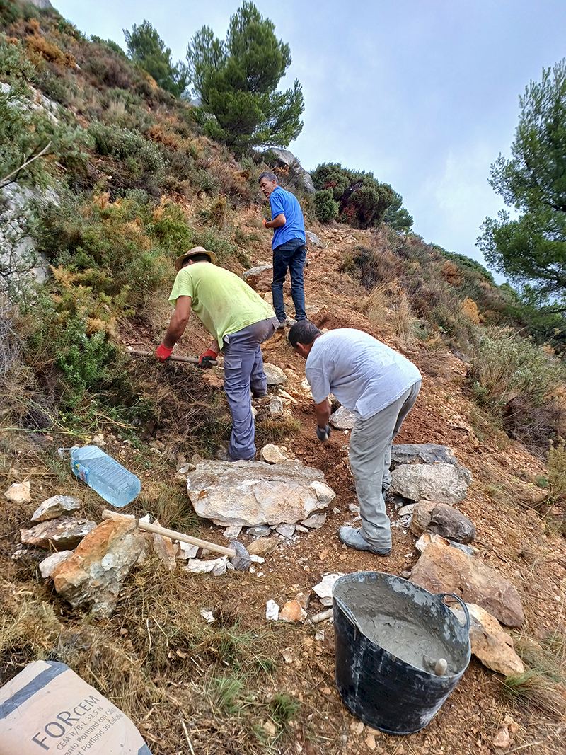 Los trabajos de adecuación y mejora del sendero consisten en diferentes actuaciones, como por ejemplo, la poda manual y desbroce de la vegetación en tramos donde el trazado original ha desaparecido; construcción de escalones en piedra seca que reducen la velocidad y el poder erosivo del agua de escorrentía y los deslizamientos en el paso de los usuarios; reparación del murete que sostiene la plataforma del camino; mejora de la señalización vertical y horizontal, entre otras.
