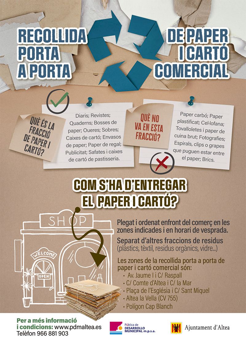 Las zonas de aplicación el servicio de recogida puerta a puerta del papel y cartón comercial son: Avda. Jaume I, C/ Raspall, C/ Compete d’Altea, C/ La Mar, Plaza de la Iglesia, C/ Sant Miquel, Altea la Vella y polígono Cap Blanch.