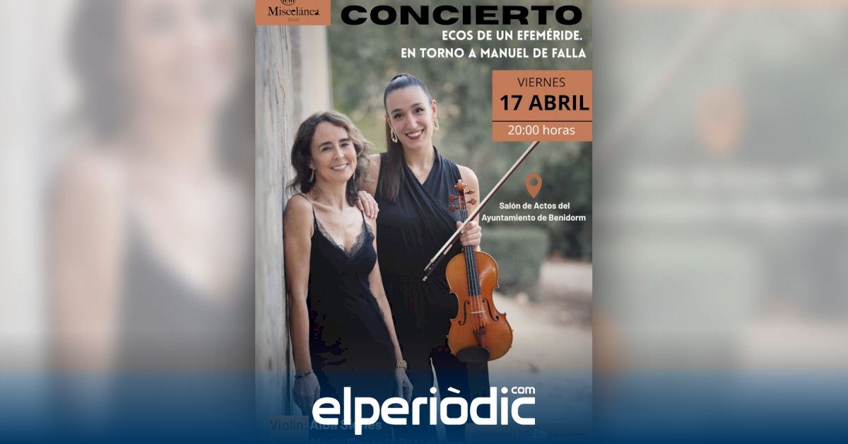 El Salón de Actos del Ayuntamiento de Benidorm albergará mañana una nueva cita del ciclo ‘Grandes Recitales’ que organiza la Concejalía de Cultura. El concierto lleva por nombre ‘Ecos de una efeméride. En torno a Manuel de Falla’ y será ofrecido por el dúo ‘Miscelánea’, formado por Alba Signes (violín) y María Eugenia Palomares (piano). Comenzará a las 20 horas y la entrada será gratuita hasta completar el aforo del recinto.