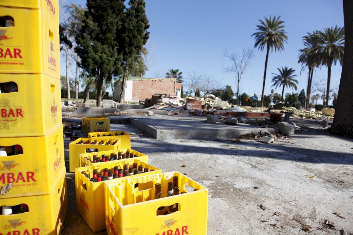 Escombros, trozos de lonas y cajas de cerveza apiladas donde estaba uno de los símbolos del imaginario colectivo de la playa de Burriana. La ciudad dice ‘adiós’ al histórico restaurante ‘El Pilón’ del antiguo camping del Arenal dos años después de iniciarse un largo y tortuoso conflicto administrativo y judicial.