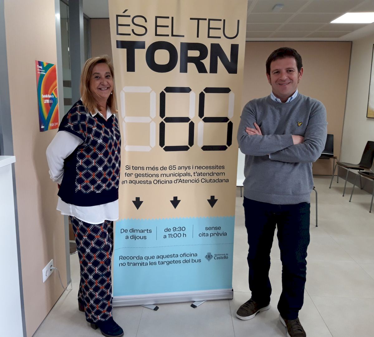 Las personas mayores de 65 años de Castelló podrán realizar gestiones en el Ayuntamiento, de manera presencial, de martes a jueves de 9.30 a 11.00 horas sin necesidad de cita previa. Es una campaña que, bajo el lema de ‘És tu turno’, pretende intentar reducir la brecha digital que sufren las personas mayores, y que ponen en valor la atención ciudadana más personalizada, ofreciendo una atención que se adecua a sus necesidades y favorezca su inclusión en la hora de acceder a la Administración.