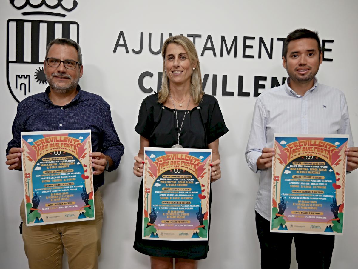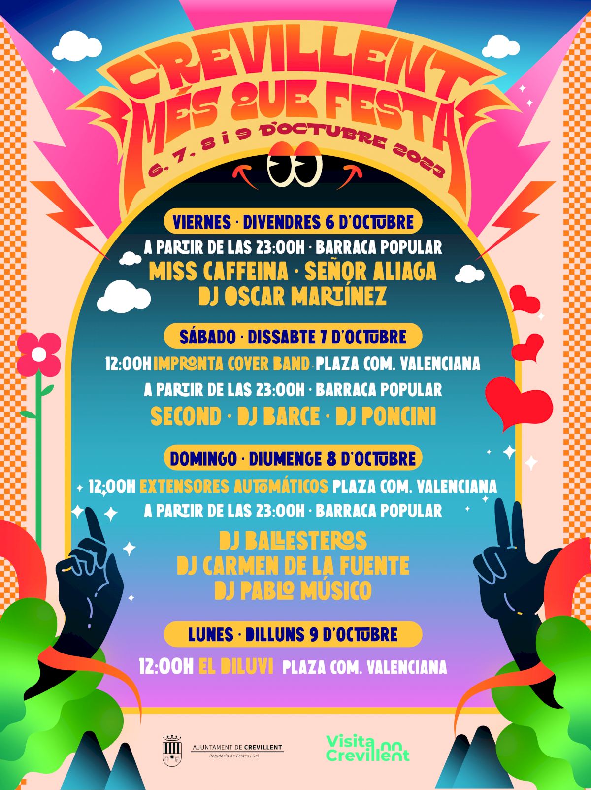 El viernes 6 de octubre, en el primer día de Barraca Municipal, en calle Óscar Esplà, actuará el grupo de música indie Miss Caffeina, “un grupo referente a nivel nacional que ha sido cabeza de cartel, que ha tocado en el Low, en el Festival de Les Arts, en el FIB, en el Sonorama”, explica García Magro. Además, actuará el grupo Señor Aliaga, con el crevillentino Carlos Mansa, que se dedica a tocar versiones de indie-pop, y como cierre se podrá disfrutar de la sesión del Dj Óscar Martínez de Los 40.