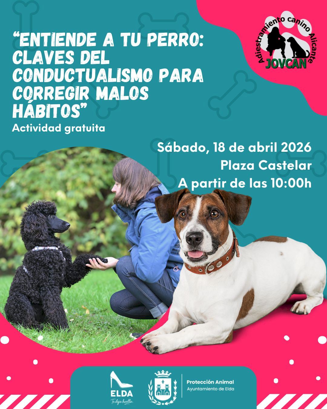La Concejalía de Protección Animal del Ayuntamiento de Elda, junto a JOVCAN, empresa de adiestramiento canino, organiza una jornada gratuita dedicada al conductualismo canino y al entrenamiento enfocado en la mejora de conductas. El evento tendrá lugar el próximo sábado 18 de abril de 2026, a partir de las 10:00 horas en la Plaza Castelar, con el objetivo de fomentar una convivencia más saludable entre perros y personas.