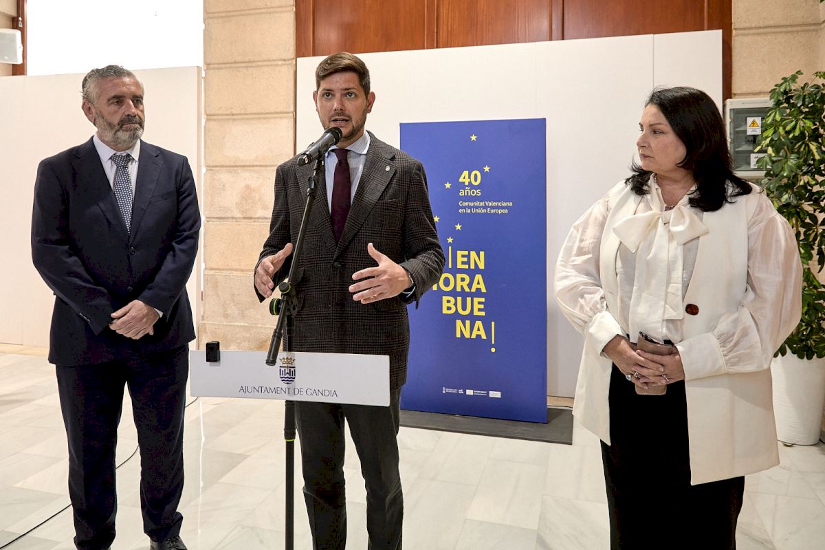 El Ayuntamiento de Gandia ha inaugurado hoy en la Sala de los Arcos la exposición conmemorativa del 40 aniversario de la firma del Tratado de Adhesión de España a la Unión Europea, una muestra que invita a la ciudadanía a reflexionar sobre el impacto del proyecto europeo en la Comunitat Valenciana y en la propia ciudad.