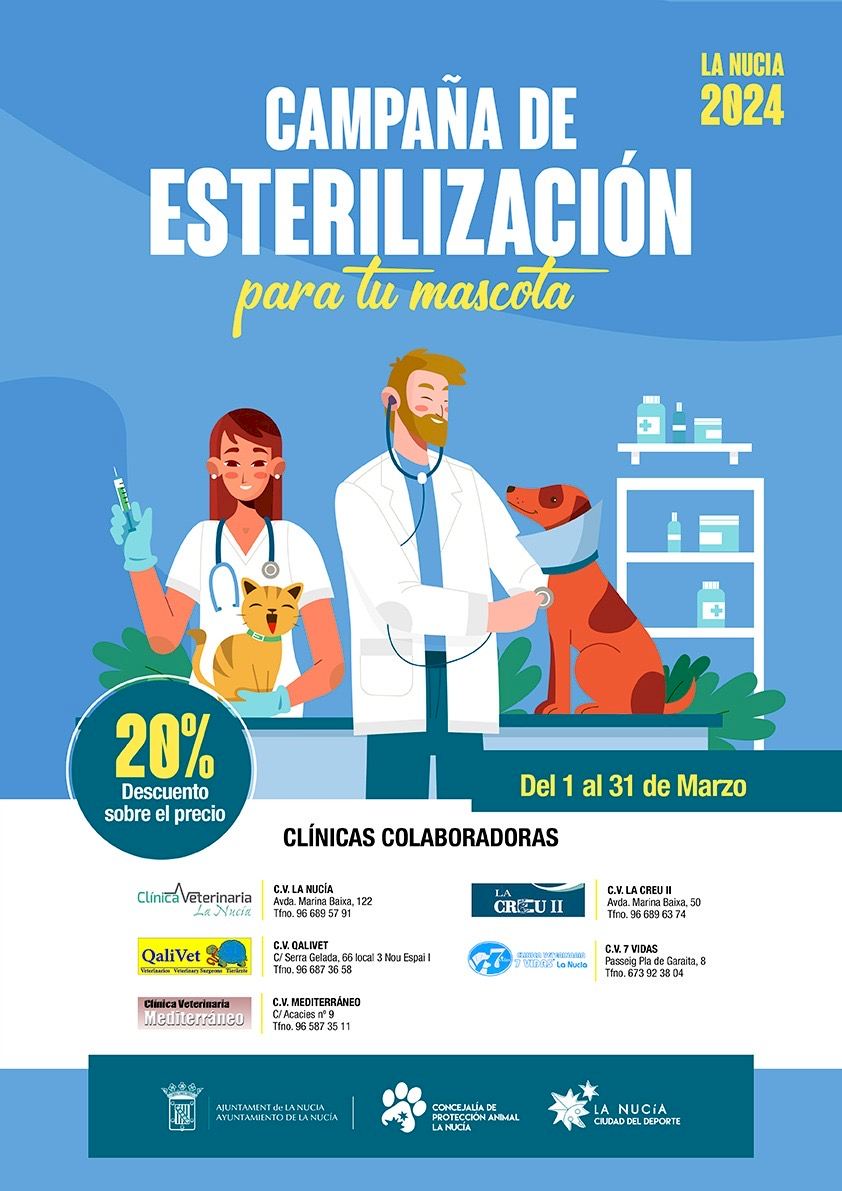 Para fomentar la esterilización se ha puesto en marcha la “Campaña de Esterilización para tu mascota 2024” desde el 1 al 31 de marzo, en la que l@s empadronad@s en La Nucía se beneficiarán de un 20 por ciento de descuento sobre la tarifa de esterilización según el tipo de mascota, gracias al acuerdo de la concejalía de Protección Animal con 5 clínicas Veterinarias de La Nucía: Clínica Veterinaria La Nucía (966895791), Clínica Veterinaria QaliVet (966873658), Clínica Veterinaria Mediterráneo (965873511), Clínica Veterinaria La Creu II (966896374) y Clínica Veterinaria 7 Vidas (673923804). Para la esterilización se recomienda la cita previa en las clínicas concertadas.