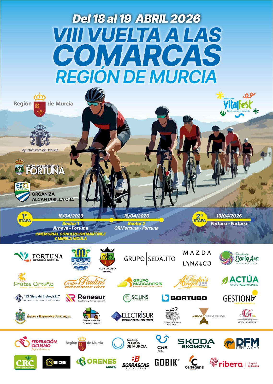 Orihuela volverá a formar parte de esta competición acogiendo la salida de la primera etapa desde la pedanía de Arneva este sábado, 18 de abril. La jornada comenzará con la presentación de equipos a las 10:30 horas, mientras que la salida oficial será a las 11:00 horas desde las instalaciones del Grupo Margarito’s, iniciando un recorrido de aproximadamente 70 kilómetros hasta la localidad de Fortuna.