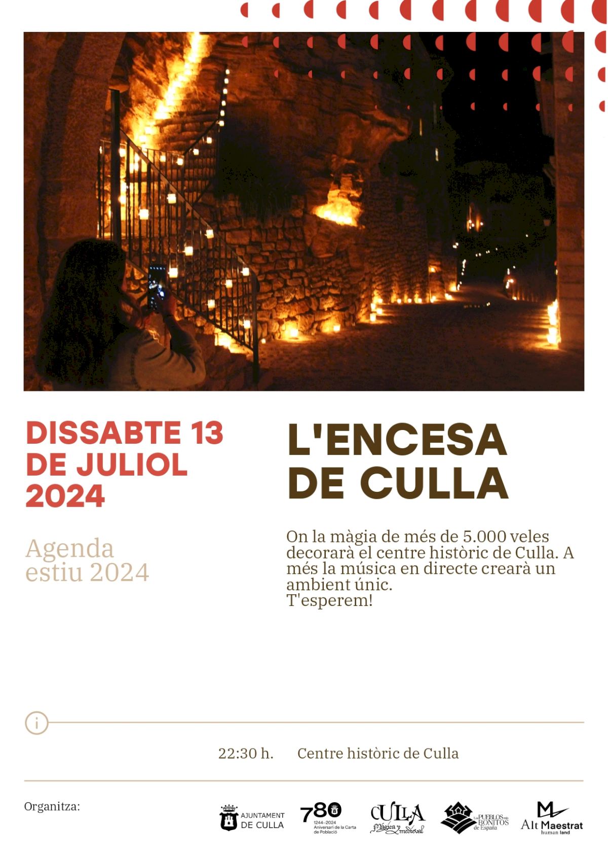El evento, en el que colaboran numerosos vecinos del municipio, contará con mas de 5.500 velas colocadas en las calles del precioso centro histórico de Culla, formando un conjunto de dibujos y líneas, que se encenderán a partir de las 22,30 horas, tras el apagado del alumbrado, y hasta las 01.30horas, dejando a todos los asistentes iluminados únicamente por la luz de las velas bajo el cielo limpio y estrellado del Alt Maestrat. Es una oportunidad perfecta de descubrir los rincones de la bella Culla en un ambiente único.
