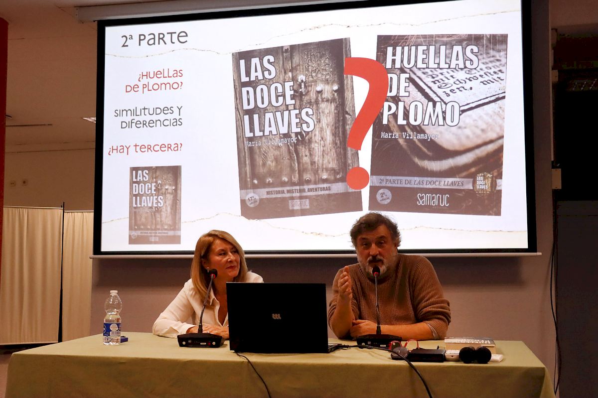 En esta ocasión fue Sabín el encargado de moderar la tertulia con María Villamayor, que contó con el apoyo de un PowerPoint que permitía al público seguir el itinerario de la novela, con los lugares claves en torno a la muralla medieval de Valencia, donde transcurre «Las doce llaves», tanto en el siglo XV como en la actualidad.