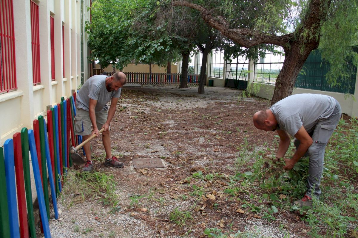 La concejal de Educación, Rosa Cervera, ha visitado las instalaciones educativas para comprobar el desarrollo de los trabajos. Allí ha charlado con el encargado de jardinería y le ha trasladado las últimas directrices a seguir para que todo este correcto al inicio de las clases.