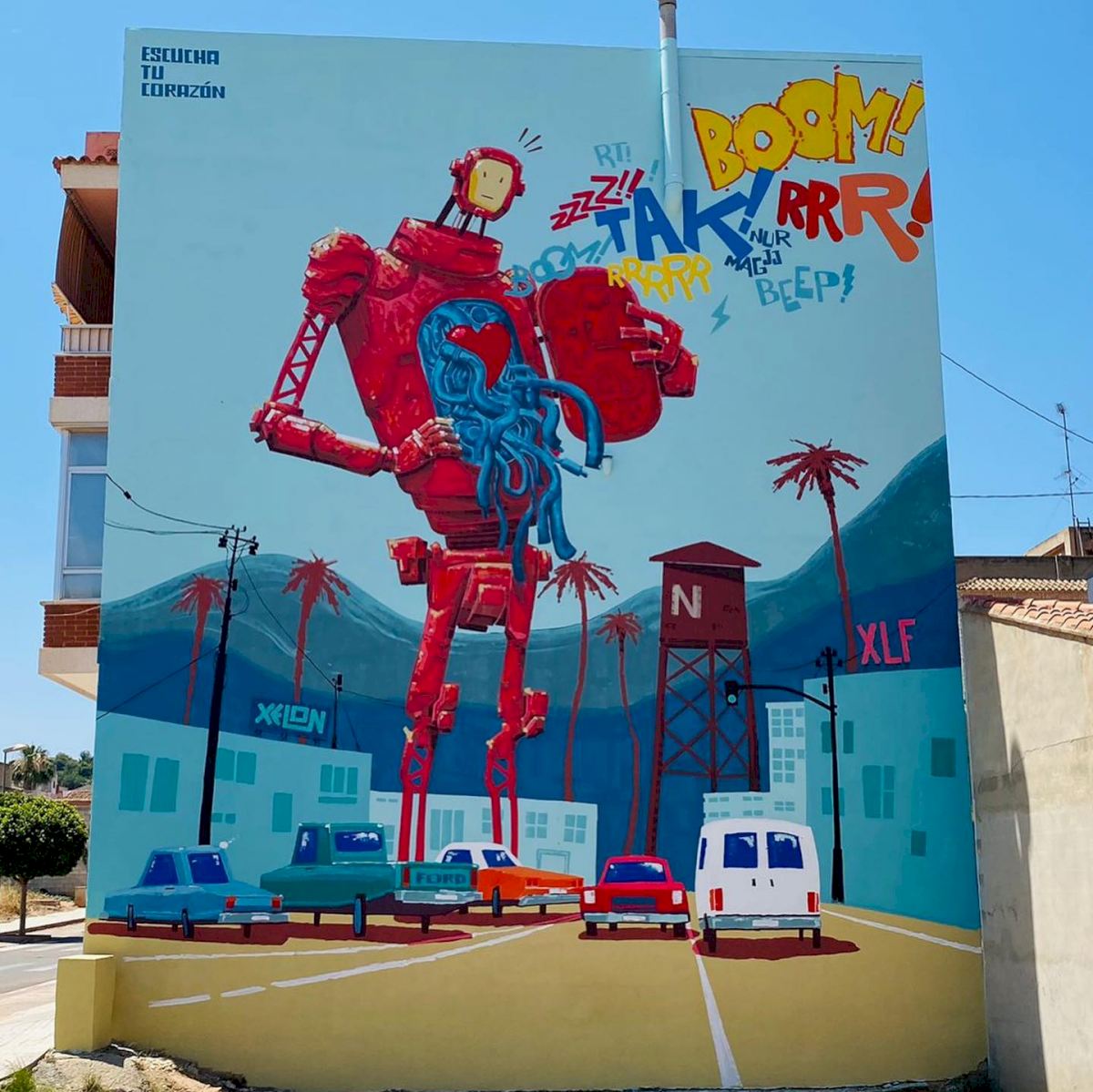 El autor también ha explicado que en esta pieza ha apostado por “jugar a mezclar varios estilos pictóricos, entre los dibujos de robots con más detalle y los escenarios y coches más de mancha pura como los hago cuando pinto en gouache, lo mismo, igual pero adaptado a unos 17x14 metros aproximadamente”.