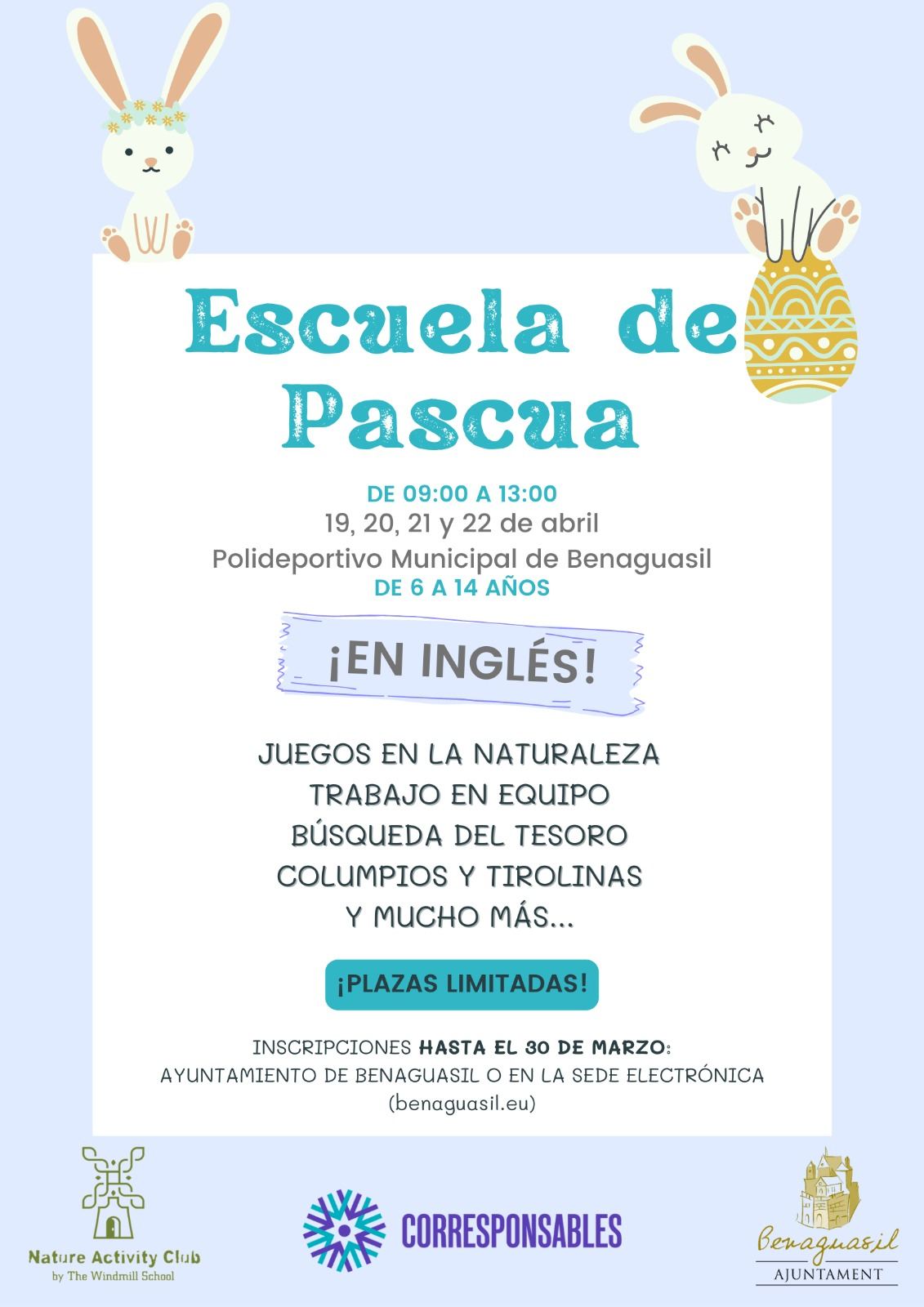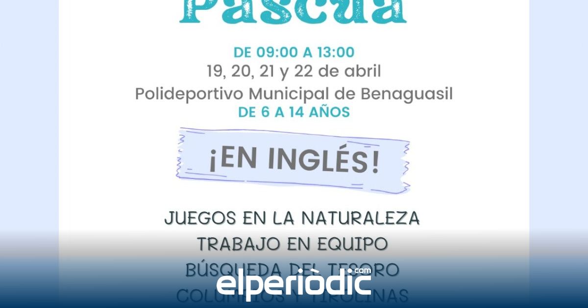 El Ayuntamiento de Benaguasil ha organizado, a través de la concejalía de Juventud, una nueva edición de la ‘Escuela de Pascua’ durante las vacaciones escolares de Semana Santa, concretamente del 19 al 22 de abril, en horario de mañana de 9h a 13h.