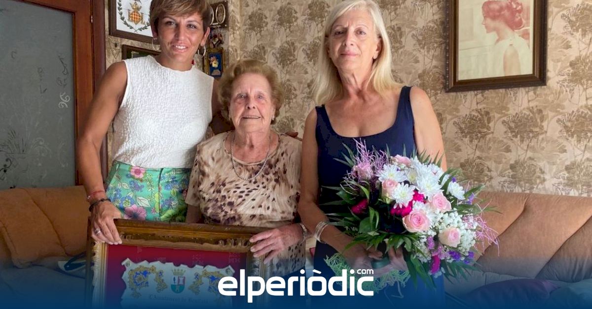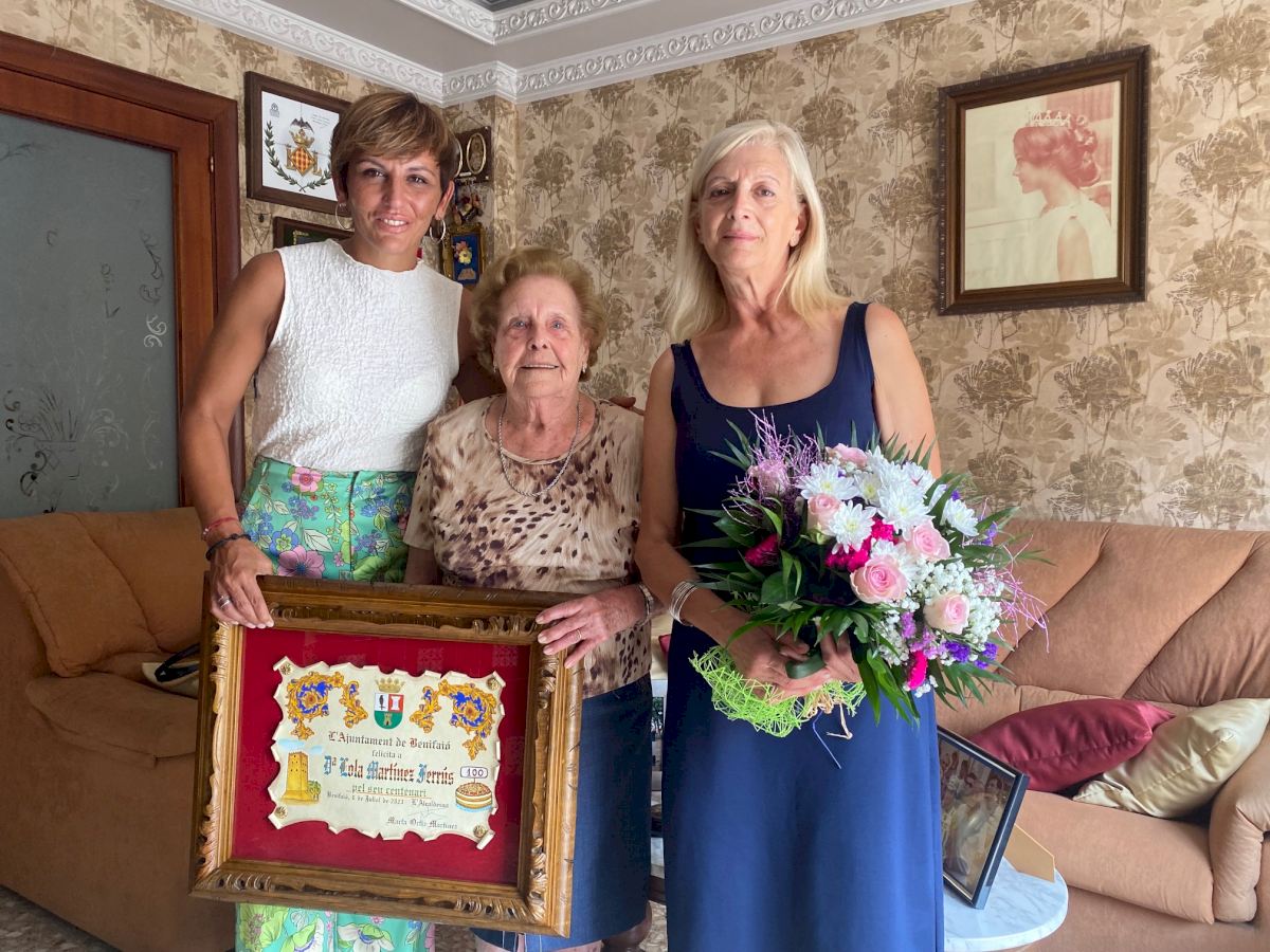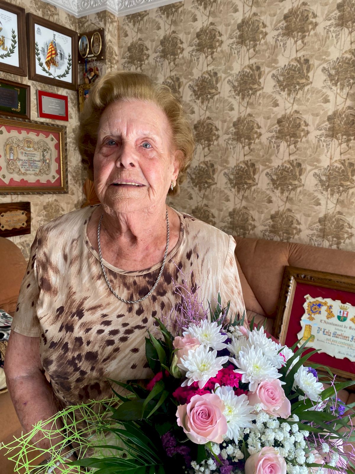 La alcaldesa Marta Ortiz y la concejal de Gente Mayor Maria José Piles han visitado a Lola en su domicilio para hacerle entrega en nombre de todo el pueblo de un ramo de flores y un pergamino como recuerdo de esta celebración. (FOTO ADJUNTA)