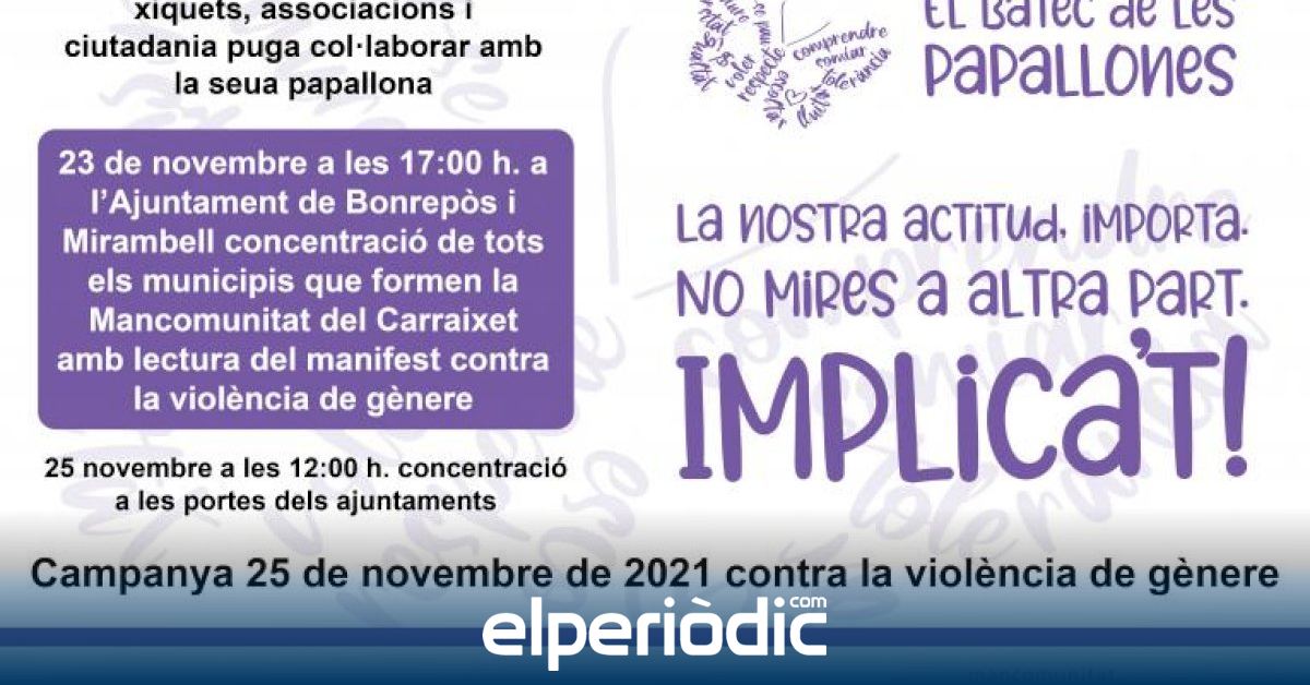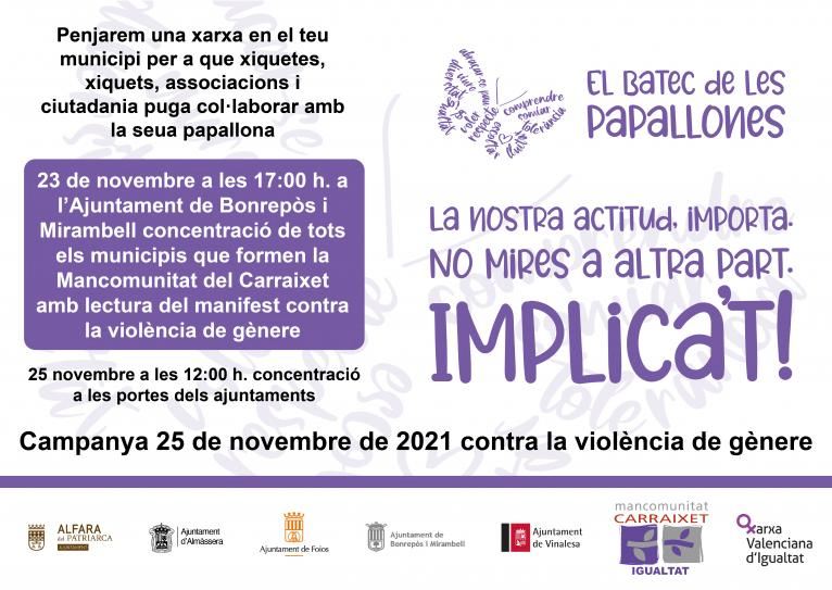 Por otro lado, el 23 de noviembre a las 17:00 horas tendrá lugar una concentración a nivel Mancomunitat en Bonrepòs i Mirambell para leer un manifiesto como rechazo a la violencia de género y, reivindicar así el fin de todo tipo de violencia machista.