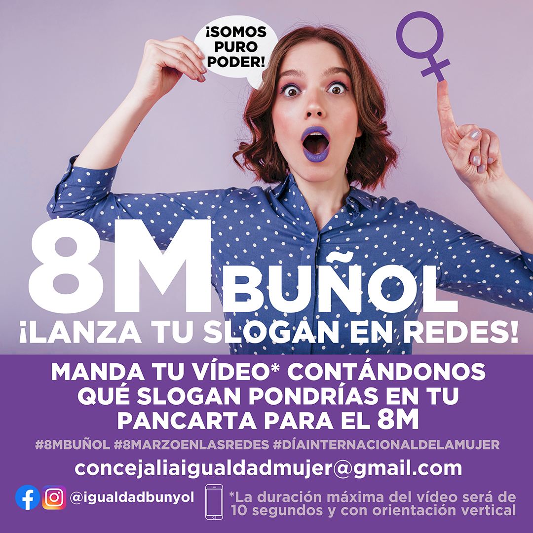 Invita a la población a que envíen un vídeo grabado en vertical y que no dure más de 10 segundos en los que lancen un slogan que sería el que se pondría en la pancarta que llevaras a la manifestación del 8M. El vídeo debe mandarse a través del Instagram de la Concejalía de Igualdad, que es @igualdadbunyol