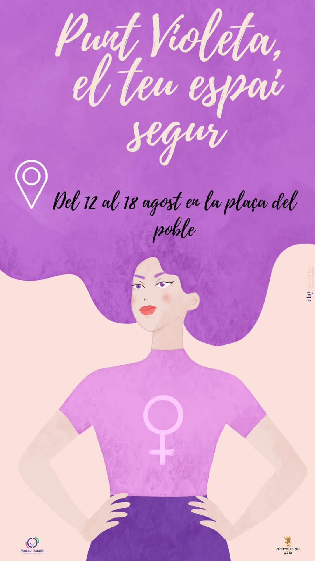 Las Fiestas de Foios volverán a contar, este año, con un punto violeta que se instalará al lado de la puerta del Ayuntamiento. Subvencionado por el Ministerio de Igualdad, dentro del Pacto de Estado contra la Violencia de Género, este punto de atención se habilitará el sábado, 12 de agosto, en horario de 23:00 a 03:00 horas; y del 13 al 18 de agosto, de 00:00 a 04:00 horas.