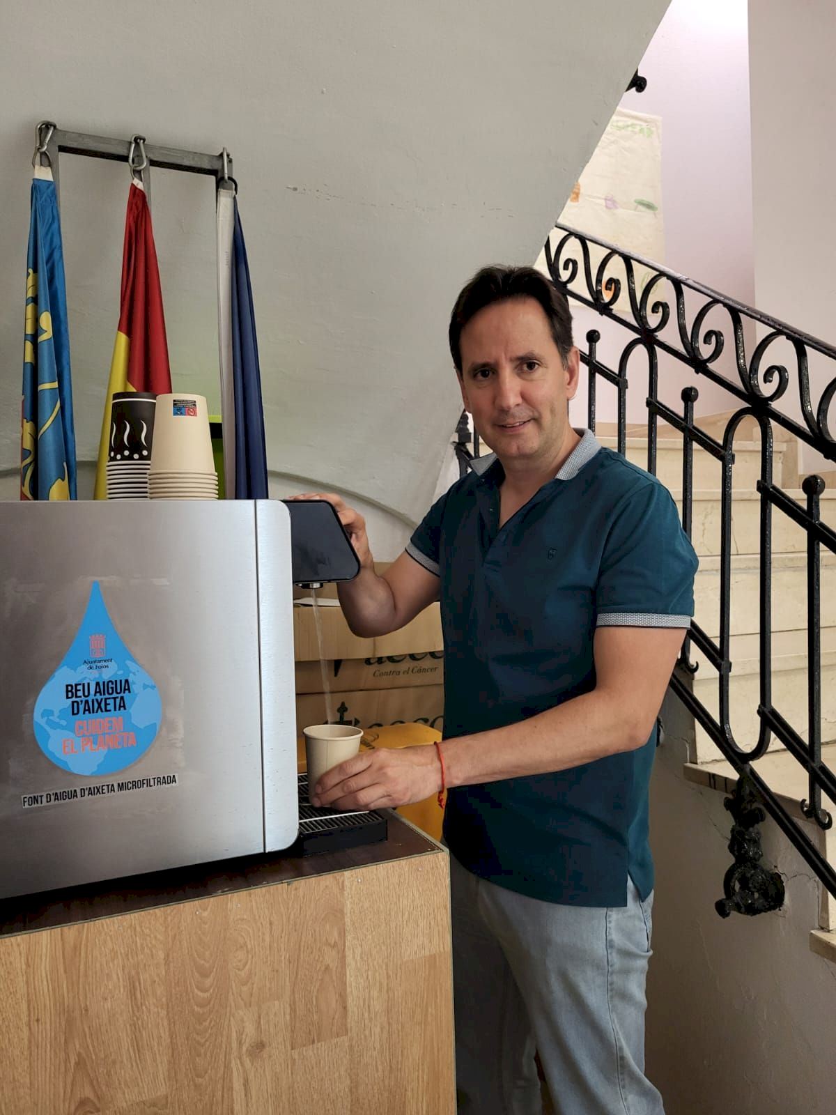 Todos los edificios municipales de Foios ya beben agua del grifo. El Ayuntamiento ha instalado un total de ocho fuentes de agua del grifo microfiltrada sustituyendo, así, el viejo sistema de fuentes de agua embotellada. Con esta iniciativa, ha explicado el alcalde de Foios, Sergi Ruiz, “disminuimos el gasto económico que supone el agua embotellada, pero sobre todo reducimos la huella ecológica, ya que se evita tanto el uso de plásticos, como el transporte”.