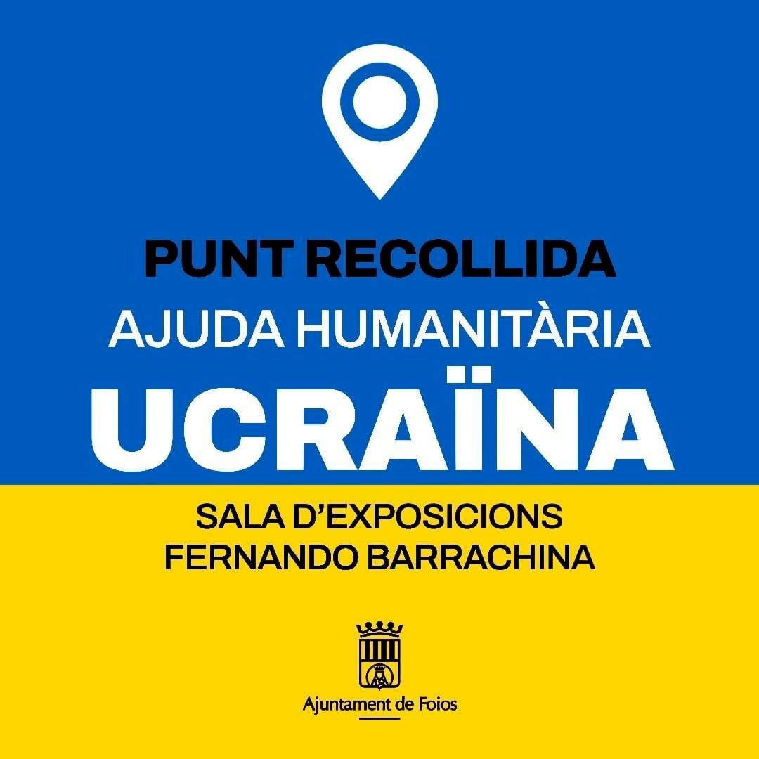 El Ayuntamiento de Foios muestra su apoyo al pueblo ucraniano. Siguiendo las instrucciones de la Generalitat Valenciana y de la Federación Valenciana de Municipios y Provincia, se ha habilitado, en la sala Fernando Barrachina, un punto de recogida de material solidario para enviar ayuda humanitaria. La entrega se podrá realizar, a partir de la próxima semana, en horario de 11:00 a 13:30 horas y de 17:00 a 19:30 horas.