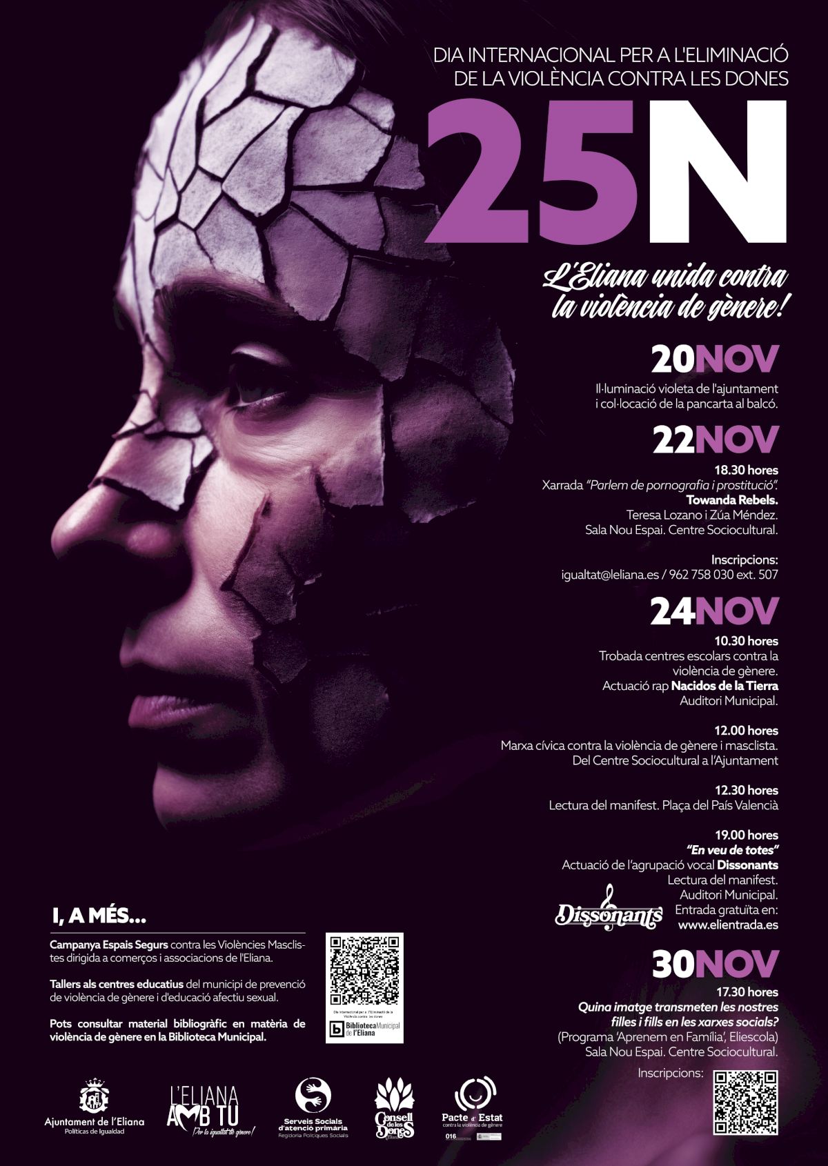 Ya por la tarde, a las 19:00 horas el Auditorio volverá a abrir sus puertas para acoger la actuación ‘En veu de totes’, de la agrupación musical elianera Dissonants. Un concierto sobre la historia de Luka y cómo es su viaje dentro del ciclo de violencia machista en que se encuentra inmersa. Las invitaciones gratuitas pueden retirarse ya en Elientrada.es. El programa se completará con la iluminación morada de la fachada del Ayuntamiento, con talleres de sensibilización y prevención en los centros educativos, la jornada de noviembre de Eliescola o la guía de consulta con material bibliográfico de la Biblioteca.