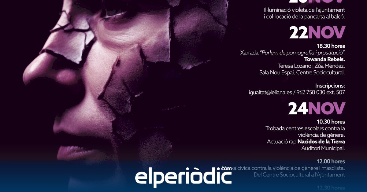 La programación del 25N arrancará el próximo lunes 20 a las 12:30 horas con la presentación de la campaña en el Salón de Plenos del Ayuntamiento y la posterior colocación de la pancarta en el balcón. El miércoles 22, a las 18:30 horas en el Nou Espai del Centro Sociocultural, tendrá lugar la charla aplazada el pasado mes de septiembre, ‘Hablemos de pornografía y prostitución’, a cargo de las comunicadoras y activistas feministas Towanda Rebels. En ella, abordarán el problema de la pornografía como actual escuela de sexualidad, sobre todo de la juventud, promoviendo modelos de violencia hacia las mujeres. Es necesario confirmar asistencia en igualtat@leliana.es.