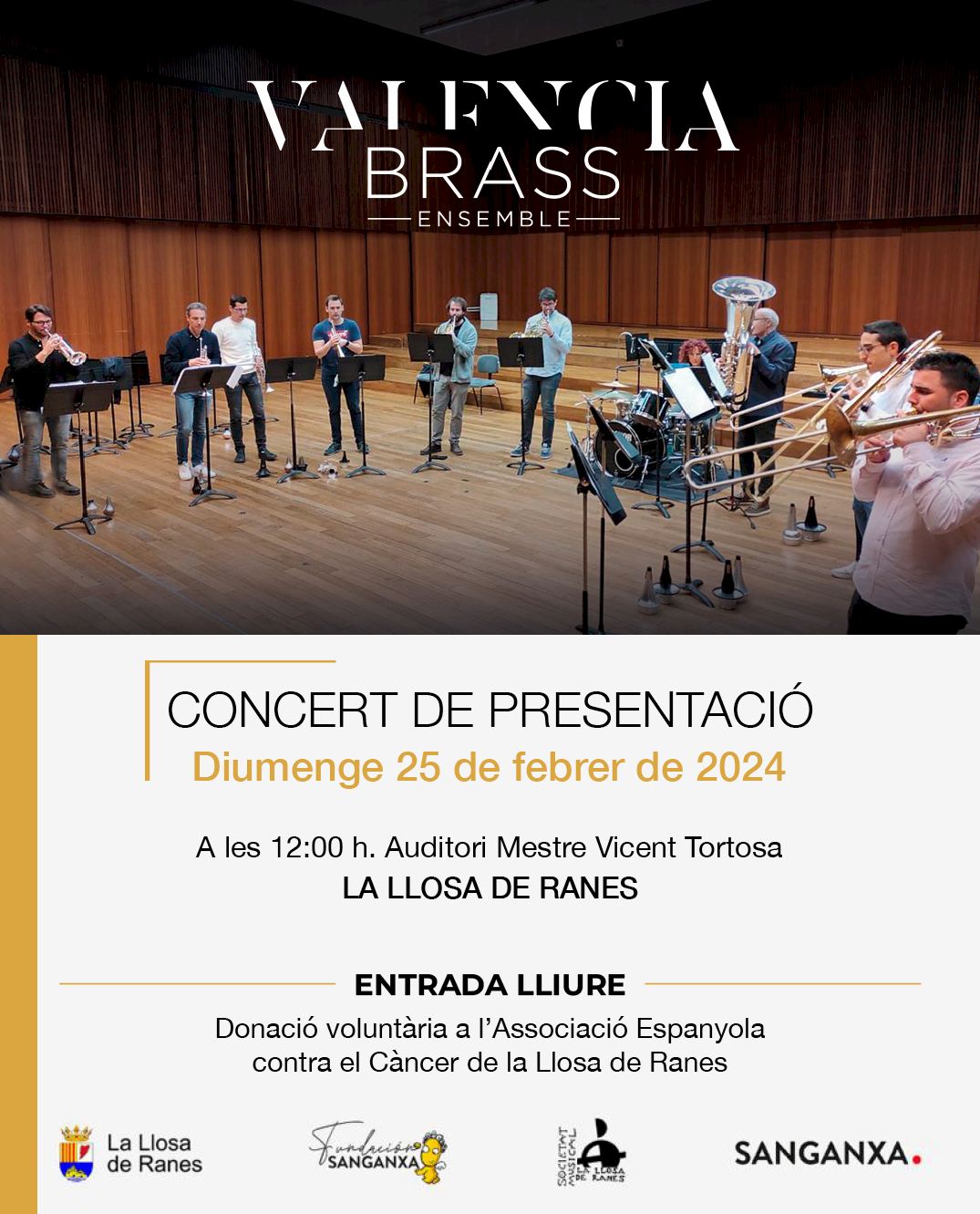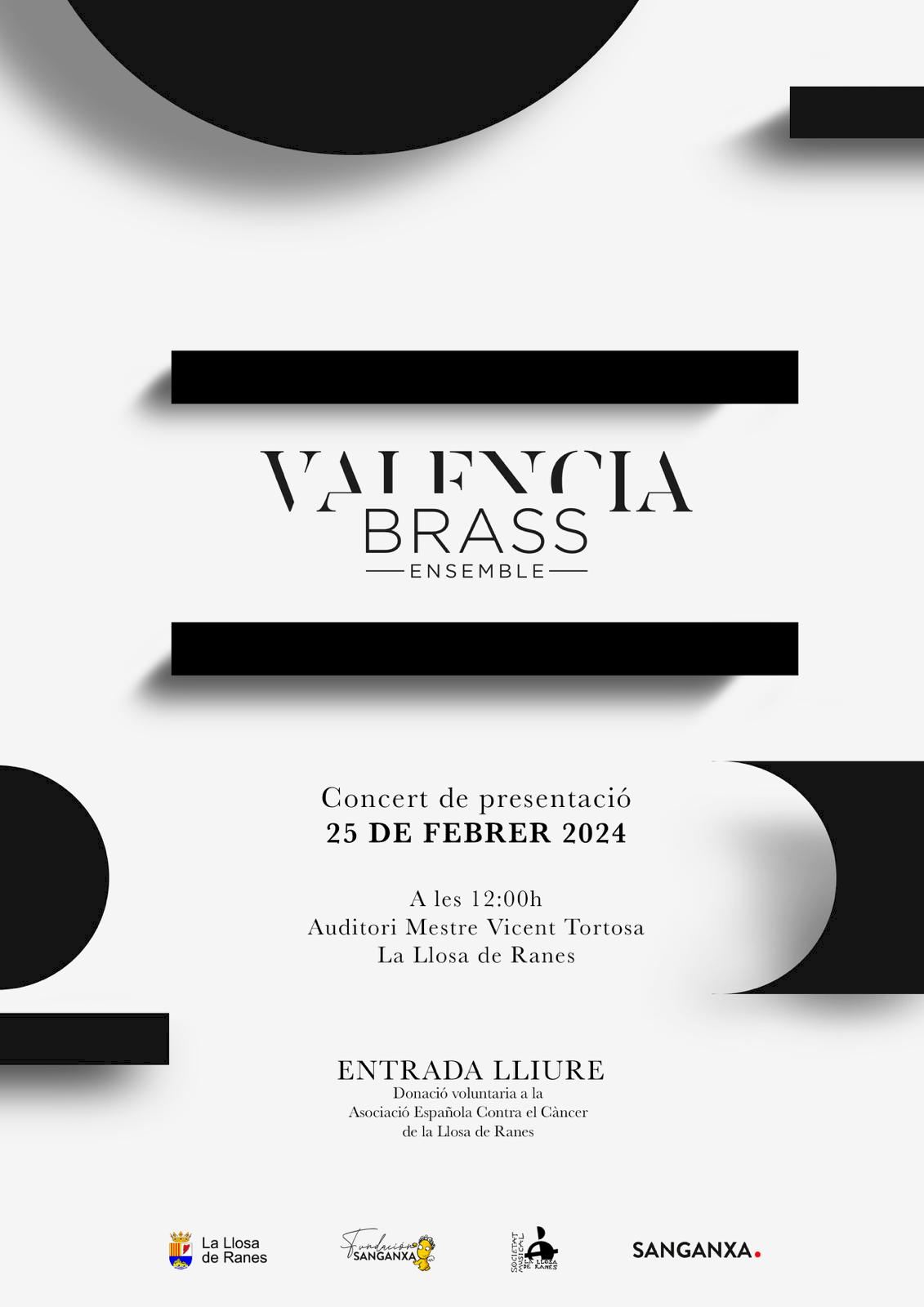 El auditorio Mestre Vicent Tortosa de la Llosa de Ranes acoge el próximo domingo, 25 de febrero, el concierto de presentación de la formación Valencia Brass Ensemble, una formación de viento metal formada por algunos de los mejores profesionales de la Comunidad Valenciana.