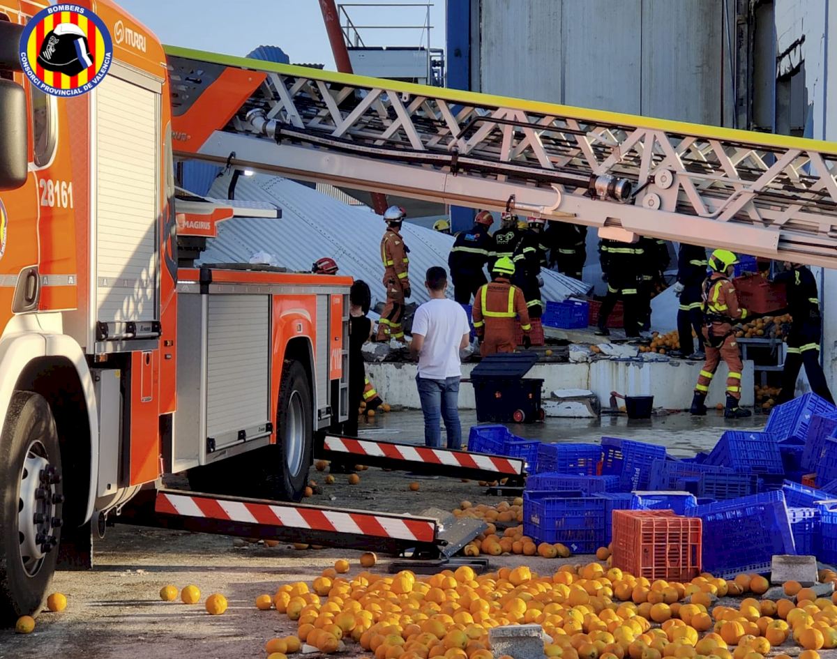Los bomberos del Consorcio Provincial de Valencia han recibido un aviso en la tarde del martes a las 18 horas que les alertaba de un derrumbamiento en un depósito de un almacén de naranjas en la Pobla de Farnals, donde en un primer momento habían desaparecido dos trabajadores.