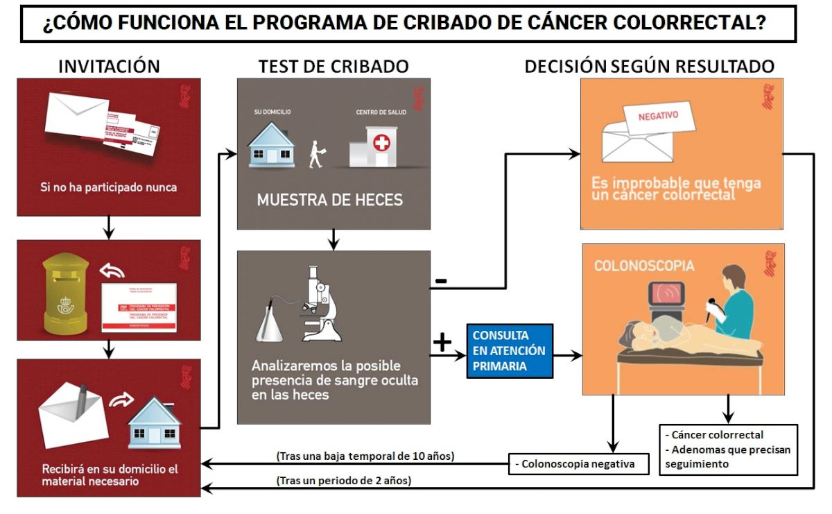 Para ello, se remite un kit para la toma de muestra al domicilio de los usuarios que han aceptado participar. A las personas con una prueba de sangre oculta en heces positiva se les ofrece la posibilidad de realizar una colonoscopia, para completar el estudio.