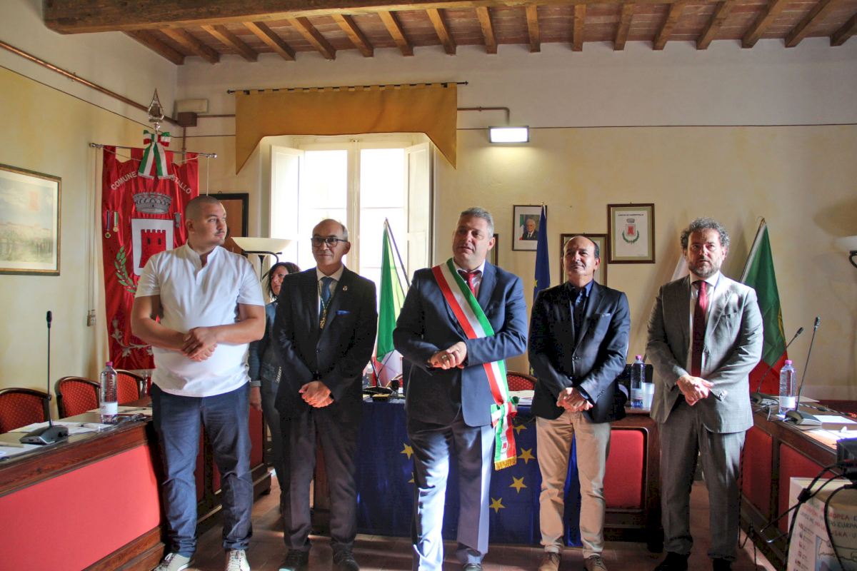 Ximo Segarra también ha participado en el acto institucional, celebrado en el salón plenario de Guardistallo, y en el que se ha firmado el convenio mediante el cual los cuatro municipios han acordado establecer lazos de amistad con el propósito de promover la cooperación y colaboración mutua y duradera en beneficio de sus instituciones, ciudadanos, escuelas y estudiantes en áreas de participación pública, cultura, artes y lenguaje. Tras la firma el alcalde ha impuesto el escudo de Benaguasil a las autoridades presentes en el acto y la Junta Local Fallera ha entregado al alcalde de Guardistallo un cuadro con recuerdos falleros de su visita a Benaguasil durante las pasadas Fallas.