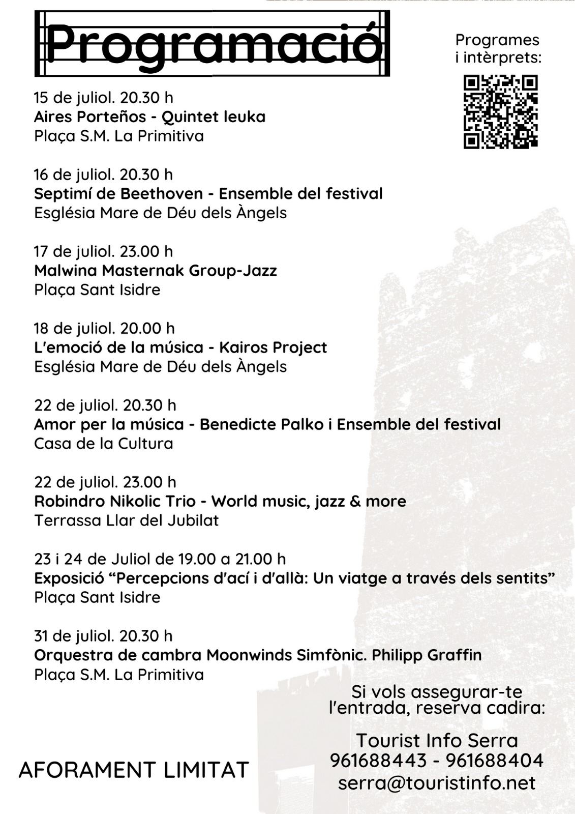 Las calles y plazas de Serra y la iglesia de la Virgen María de Àngels serán los escenarios para acoger los siete conciertos en los cuales la música de cámara será el hilo conductor. Una música representada en multitud de estilos que van del jazz al barroco, el folk mediterráneo y el folk latino y americano con obras de Johanes Brams, Clara Shumann, Maurice Ravel, Joseph Haydin, Matilde Salvador o Beethoven, bajo la dirección artística de Salvador Bolón, miembro de la orquesta de la Comunidad Valenciana-Palau de les Arts y vinculado al municipio de Serra.