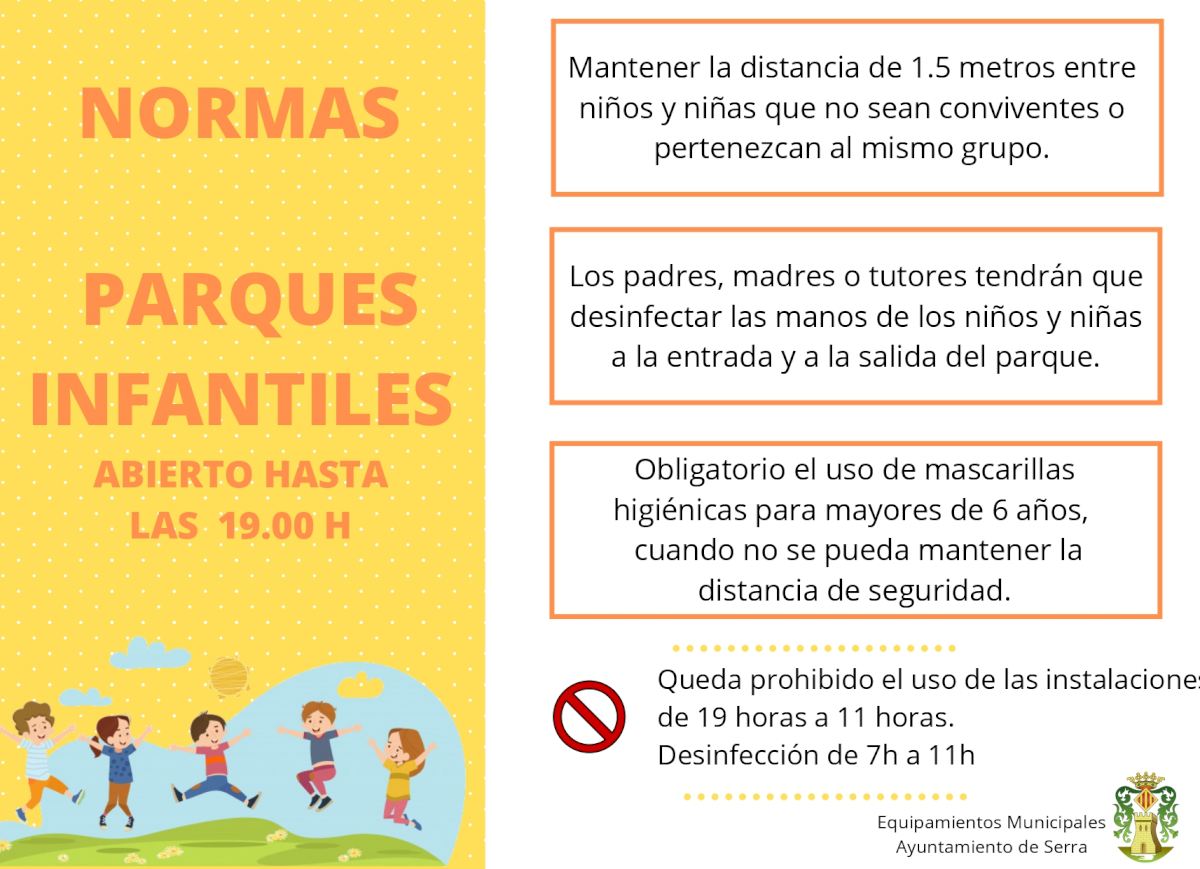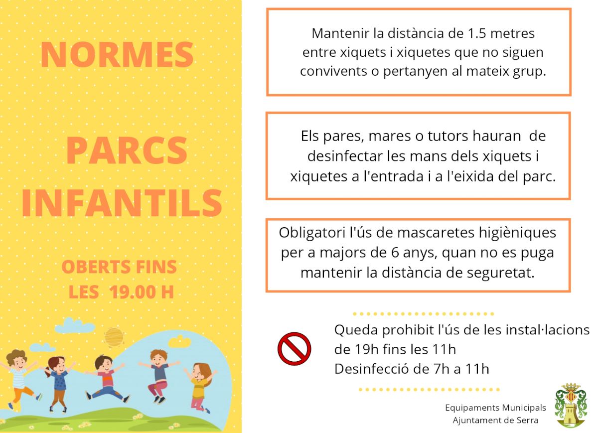 El Ayuntamiento de Serra está implantando nuevas medidas para luchar contra la covid19 por ello ha reducido el horario de los parques infantiles municipales hasta las 19.00 horas. Solo se podrá hacer uso de los parques desde las 11.00 de la mañana hasta las 19.00 horas. Unos espacios que desde que reabrieron solamente estaban en uso a partir de las 11.00 horas debido a las tareas de desinfección y limpieza que se hacen diariamente por los servicios municipales.