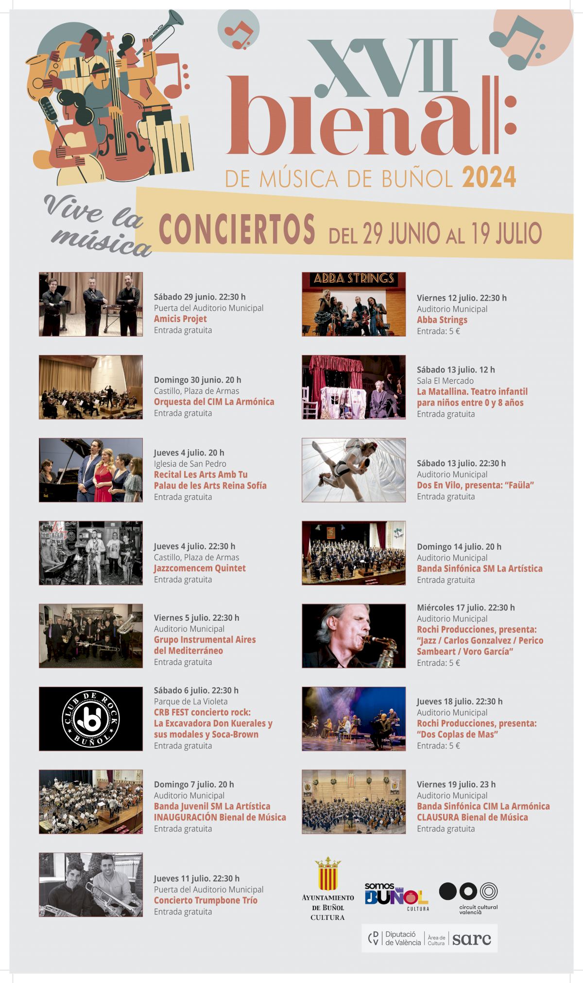 La XVII Bienal de Música de Buñol arrancó el pasado sábado y finalizará el 19 de julio, un poco antes de lo habitual por la participación de las dos bandas sinfónicas de la localidad en el Certamen de Valencia.