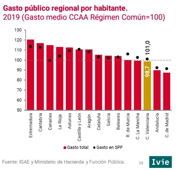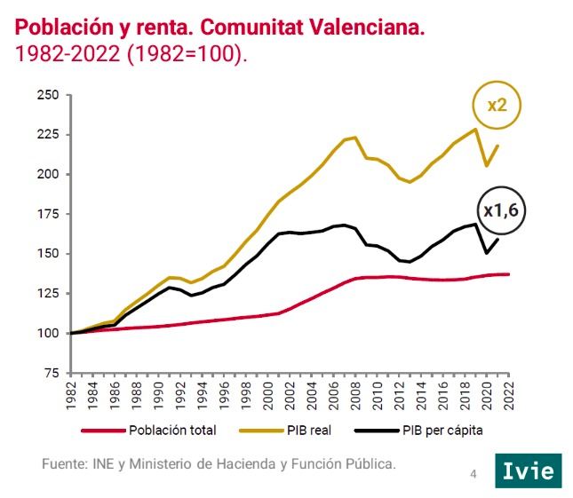 Sin embargo, las mejoras de productividad y salarios han sido inferiores a las de otras regiones, por lo que, a pesar de los progresos, la economía valenciana ha divergido de otros territorios más prósperos y el PIB per cápita está 12 puntos por debajo de la media nacional, cuando en 1982 se situaba en la media.