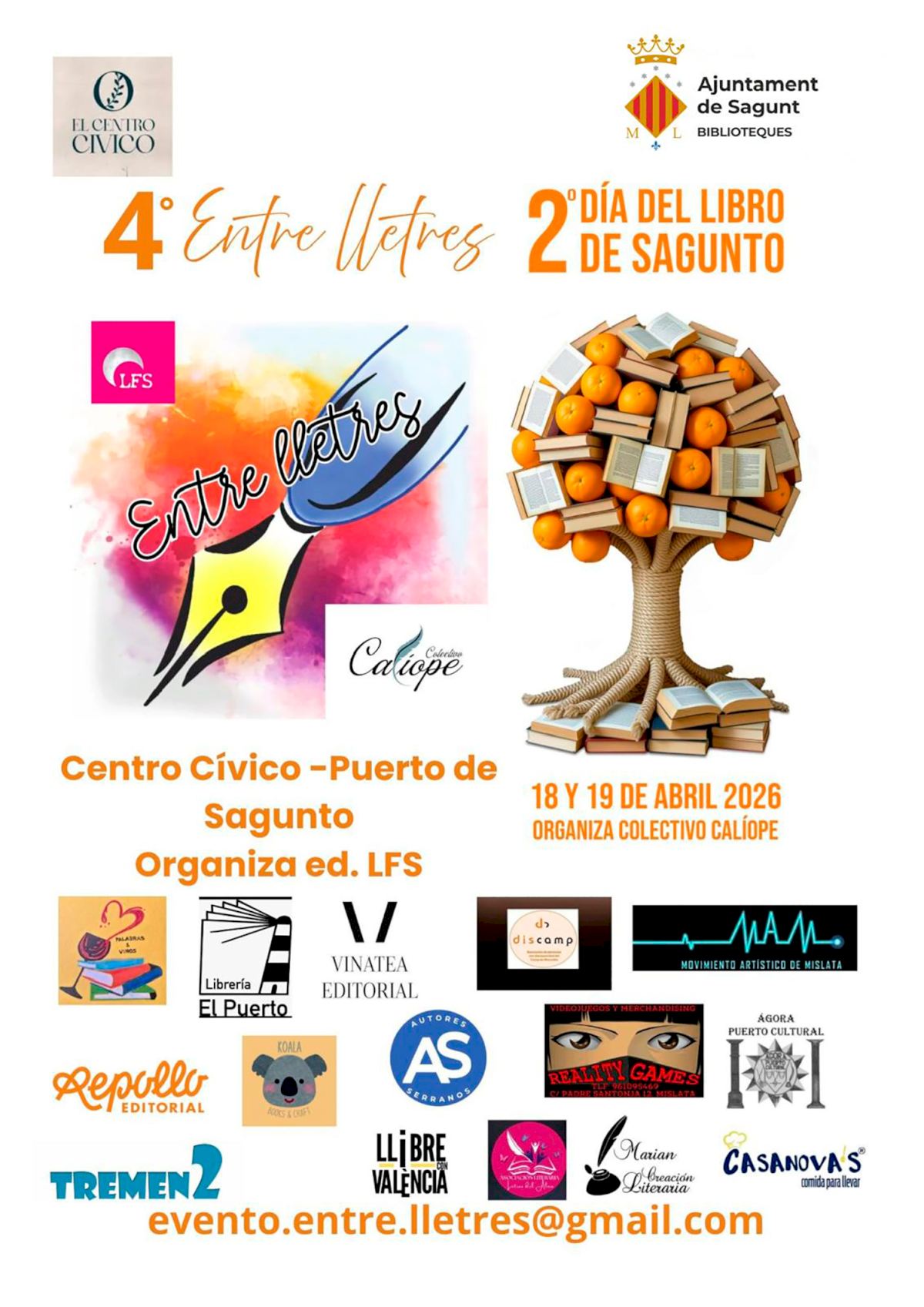 La Concejalía de Bibliotecas del Ayuntamiento de Sagunto colabora en la realización del evento literario Entre Lletres, que celebra su cuarta edición y que está organizado por la editorial La Fábrica de Sueños y el colectivo Calíope Sagunto. El evento, que incluye el 2º Día del Libro de Sagunto, se llevará a cabo el 18 y el 19 de abril en el Centro Cívico Antiguo Sanatorio de Puerto de Sagunto.