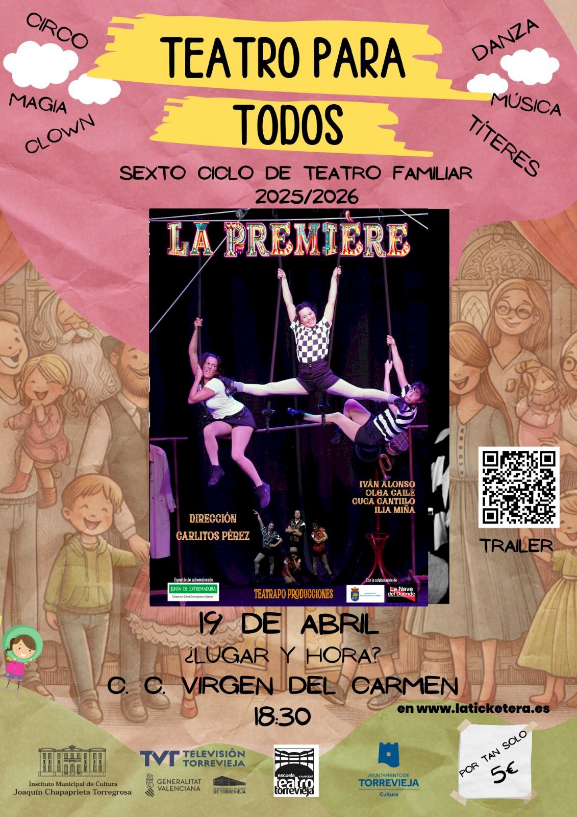 Con motivo del Día Mundial del Circo, el ciclo acoge el espectáculo “LA PREMIERE”, de la compañía Teatrapo, que se representará el próximo domingo, 19 de abril, a las 18:30 horas, en el Centro Cultural Virgen del Carmen. La función está recomendada para público a partir de 5 años.