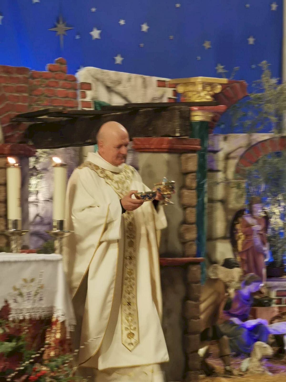 Realizó una misa distinta, donde lanzó un mensaje de alegría y amor, en la homilía, donde se dirigió a los asistentes manifestando el sentimiento de escuchar el anuncio de la iglesia: “Dios ha Nacido”. Y con el anuncio, nos ponemos en movimiento con el deseo de encuentro con el Niño en lo humilde y pequeño, como el pesebre, siendo Jesus nuestro alimento, que se encuentra en la Eucaristía.