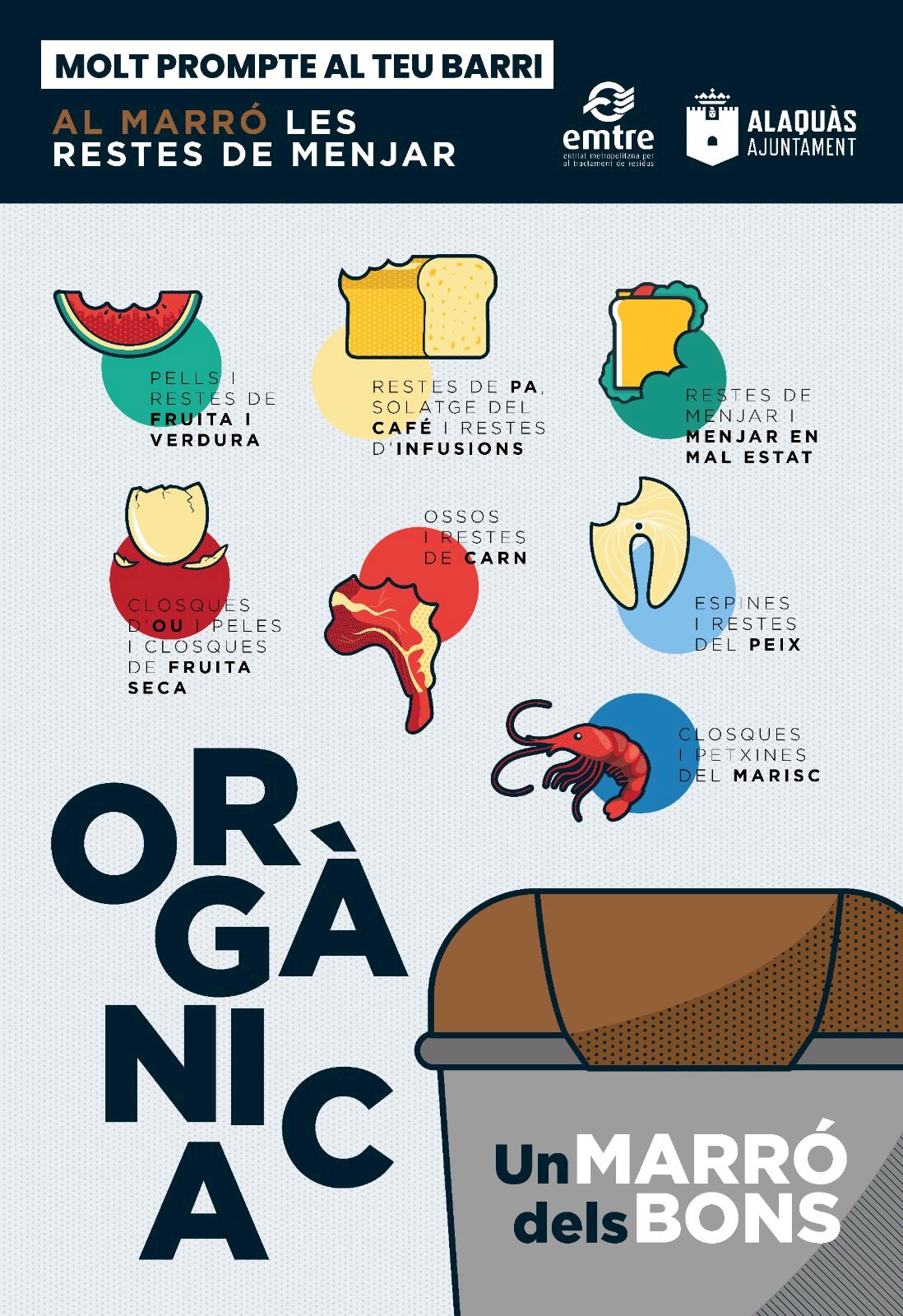 L’Ajuntament d’Alaquàs ha llançat una nova campanya informativa per a donar a conéixer a la ciutadania el nou contenidor marrón destinat a recollir els residus orgànics tant dels domicilis com de l’hostaleria. Sota el lema “El contenidor marró molt prompte al teu barri”, des de del Consistori es vol conscienciar la ciutadania sobre la importància de reconéixer quins són els residus que han de destinar-se a aquest nou dipòsit de reciclatge així com els seus beneficis.