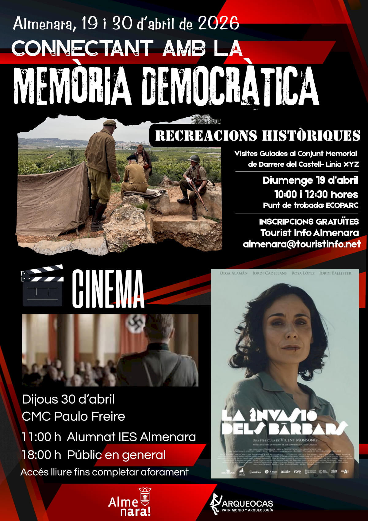 L’Ajuntament d’Almenara ha organitzat els pròxims dies 19 i 30 d’abril un cicle d’activitats anomenat “Connectant amb la Memòria Democràtica” que combina recreació històrica i cinema amb l’objectiu d’apropar la memòria històrica a la ciutadania des d’una perspectiva divulgativa i participativa.