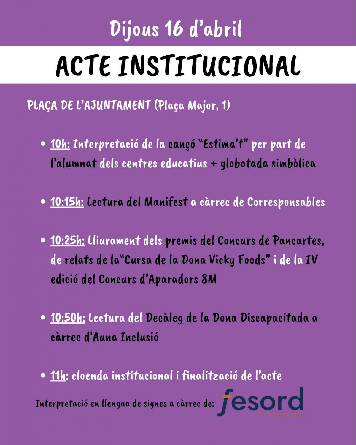 Així mateix, es donarà a conéixer el manifest del decàleg de la dona amb discapacitat, a càrrec d’Auna Inclusió, reforçant així els valors d’inclusió, respecte i equitat.