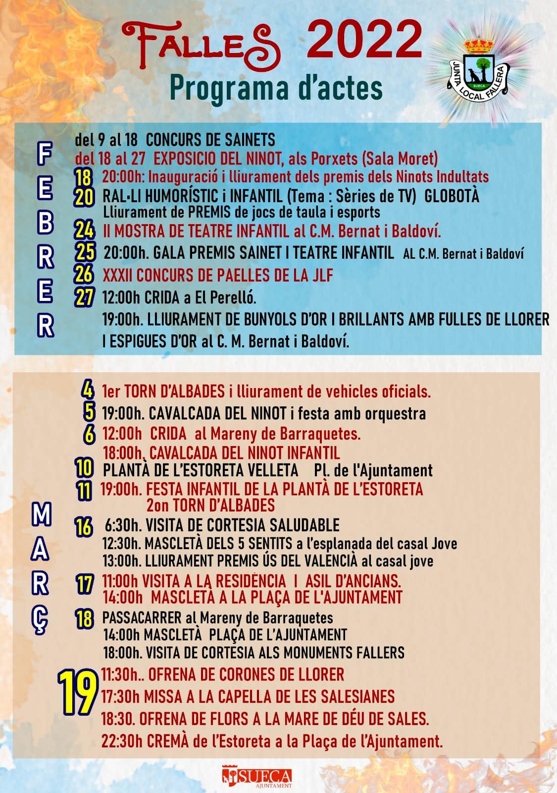 Sueca arranca la celebració de les Falles 2022 amb més ganes que mai. La localitat valenciana ja està immersa en el calendari faller i es prepara per a actes tan esperats com la cavalcada del Ninot, la plantà, les mascletaes dels dies centrals de festa o l'ofrena. A més, les comissions han preparat actes als seus respectius casals i falles que ompliran la ciutat d'ambient faller a cada cantonada.