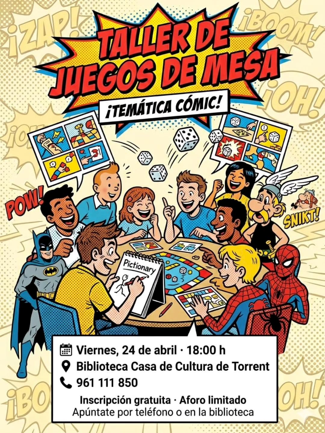 L'Ajuntament de Torrent, a través de la Regidoria de Cultura, ha organitzat un original Taller de Jocs de taula amb temàtica còmic que tindrà lloc divendres que ve, 24 d'abril, a les 18.00 hores, a la Biblioteca Casa de Cultura.