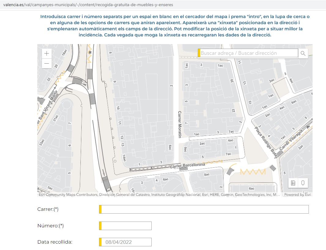 El formulari, disponible en l'apartat “A un clic” del web municipal www.valencia.es, demana a la persona usuària les dades de contacte i informació sobre els objectes a retirar. Una vegada emplenat, la persona usuària també ha de seleccionar al mapa la ubicació on dipositarà els objectes així com la data en què desitja que es realitze eixa recollida. El mateix formulari generarà –en funció del districte i la contracta responsable del mateix– les opcions d'horari en què es podrà efectuar la recollida i el procés es completarà per personal tècnic municipal, que enviarà a la persona usuària un correu electrònic amb un codi alfanumèric amb què identificar el servici de recollida.
