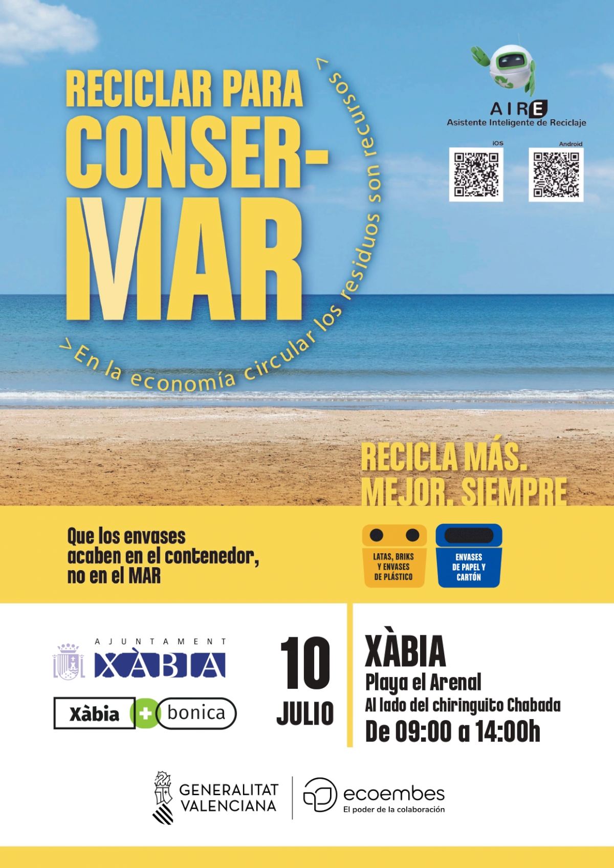 L'Ajuntament de Xàbia i l'empresa responsable de la recollida dels residus, Tetma s'han unit a la campanya “Reciclar per a ConserMar” promoguda per Ecoembes, l'entitat sense ànim de lucre que s'encarrega del reciclatge dels envasos de plàstic, en una jornada que se celebrarà el dia 10 de juliol en la zona central de la Platja de l'Arenal, de 9:00 a 14:00 hores.