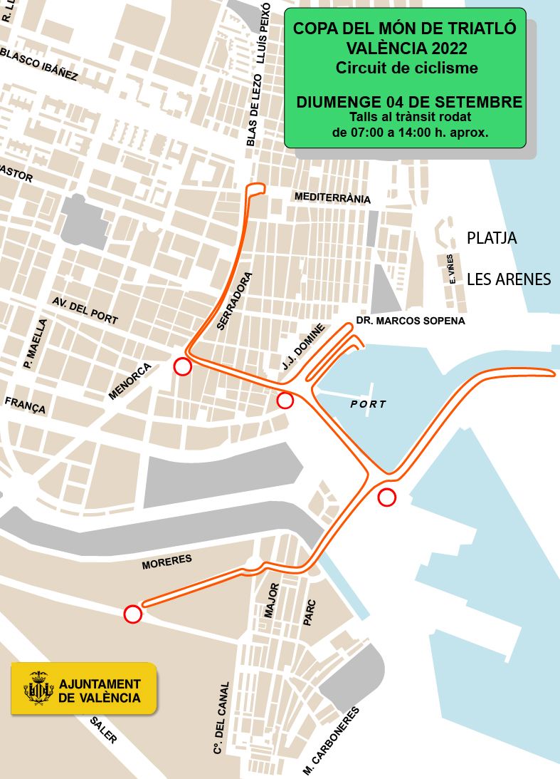 Tal como ha informado el Centro de Gestión de tráfico, el circuito de ciclismo partirá desde la zona exterior de la dársena de la Marina de València, y recorrerá la avenida del Puerto y el Bulevar de Serrería (en dirección hacia la avenida dels Tarongers) hasta llegar a la altura de la calle Martí Grajales, y vuelta por el mismo sentido de Serrería, avenida del Puerto, calle Ingeniero Manuel Soto, puente de Astilleros, plaza de les Moreres, y calle de les Moreres hasta la rotonda con la CV-5010, donde se efectuará un giro de 180º para volver por el mismo sitio hasta la rotonda frente al Tinglado nº5. Desde allí, se accederá al paseo de la Calma hasta el parque de la Bufa la Nau donde se realiza un giro de 180º para volver por el paseo de la Calma hasta el Tinglado nº5 y finalizando en la parte exterior de la dársena de la Marina de València, en el punto de salida de la prueba.