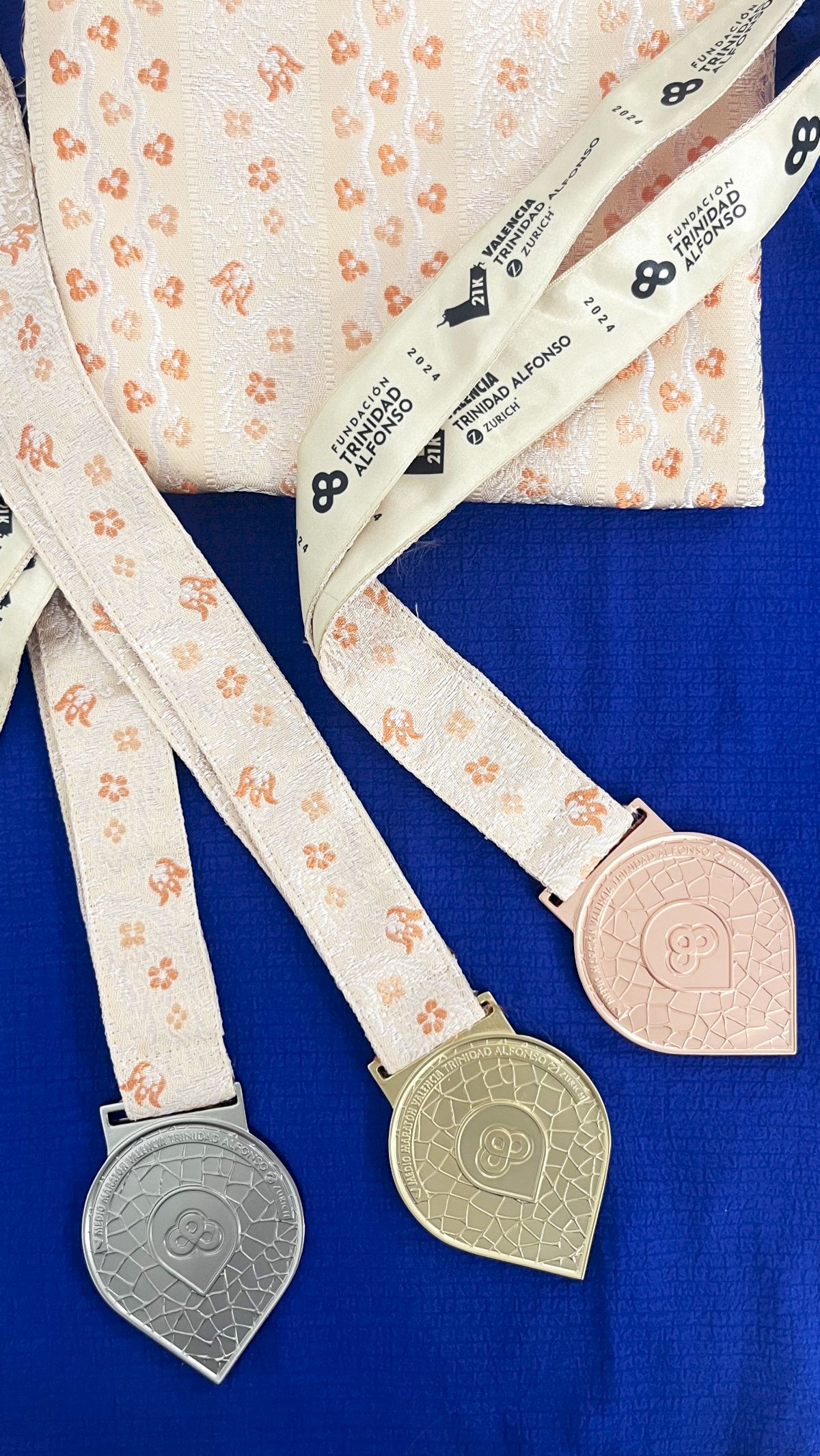 Las medallas de los ganadores y ganadoras absolutos del Medio Maratón Valencia Trinidad Alfonso Zurich y del Maratón Valencia Trinidad Alfonso Zurich homenajearán en sus ediciones de 2024 a la cultura tradicional valenciana y al gremio de la seda gracias a la colaboración de las pruebas con Compañía Valenciana de la Seda, que ha elaborado dos tejidos con una combinación de colores exclusiva para la ocasión.