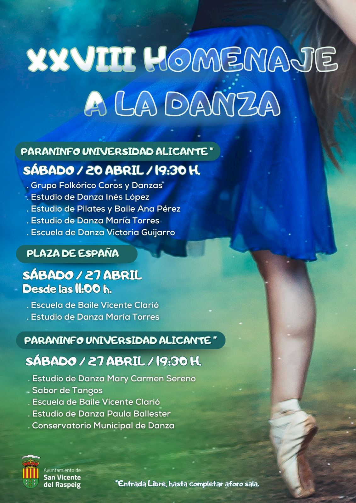 El Ayuntamiento de San Vicente del Raspeig, a través de la Concejalía de Cultura, ha organizado el XXVIII Homenaje a la Danza con dos galas que, por primera vez, se llevarán a cabo en el Paraninfo de la Universidad de Alicante los días 20 y 27 de abril.
